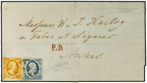 1,3 1852 AMSTERDAM a ANVERS (Bélgica). 5 cts. azul y 15 cts. amarillo. MAGNIFICA.