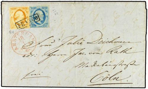 1,3 1864 AMSTERDAM a COLN. 5 cts. azul y 15 cts. amarillo. MAGNIFICA.