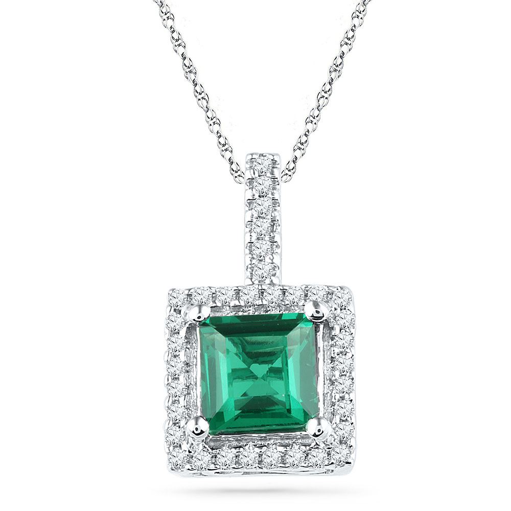 10kt White Gold Womens Cushion Lab-Created Emerald Solitaire & Diamond Pendant 1-3/8 Cttw