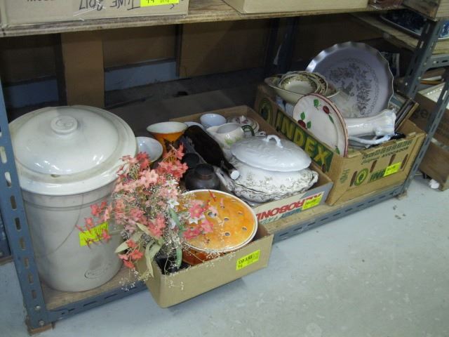 1 3 BOXES OF MISC DISHES, VASES AND DISTRESSED MADALTA CROCK