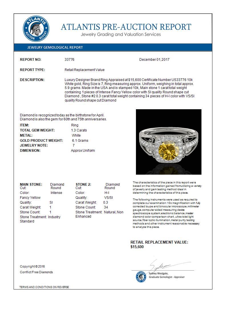 REF-236F4N -33776 ---- 1.3 CTW Certified Si/I Fancy Intense Yellow Diamond Solitaire Halo Ring 10K White Gold ---- Luxury Designer Brand Ring Appraised at $15,600 Certificate Number US33776 10k White gold, Ring Size is 7, Ring measuring approx. Uniform, weighing in total approx. 5.9 grams. Made in the USA and is stamped 10k, Main stone 1 carat total weight containing 1 pieces of Intense Fancy Yellow color with SI quality Round shape cut Diamond , Stone #2 0.3 carat total weight containing 34 pieces of H-I color with VS/SI quality Round shape cut Diamond