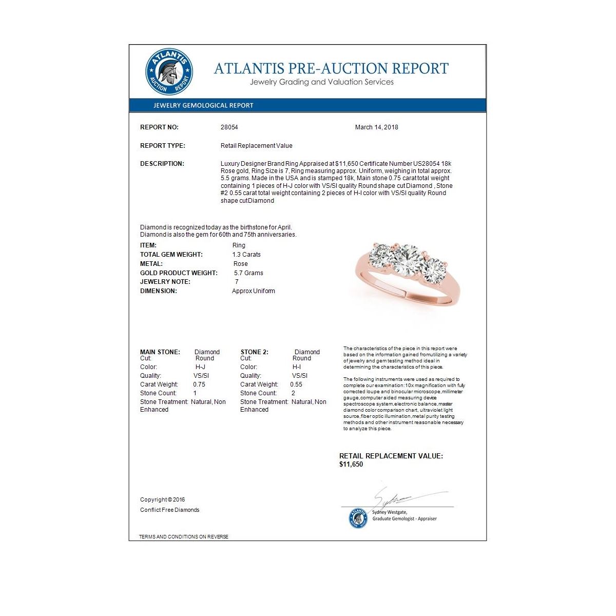 REF-235K3W -28054 ---- 1.3 CTW Certified VS/SI Diamond 3 Stone Solitaire Ring 18K Rose Gold ---- Luxury Designer Brand Ring Appraised at $11,650 Certificate Number US28054 18k Rose gold, Ring Size is 7, Ring measuring approx. Uniform, weighing in total approx. 5.5 grams. Made in the USA and is stamped 18k, Main stone 0.75 carat total weight containing 1 pieces of H-J color with VS/SI quality Round shape cut Diamond , Stone #2 0.55 carat total weight containing 2 pieces of H-I color with VS/SI quality Round shape cut Diamond