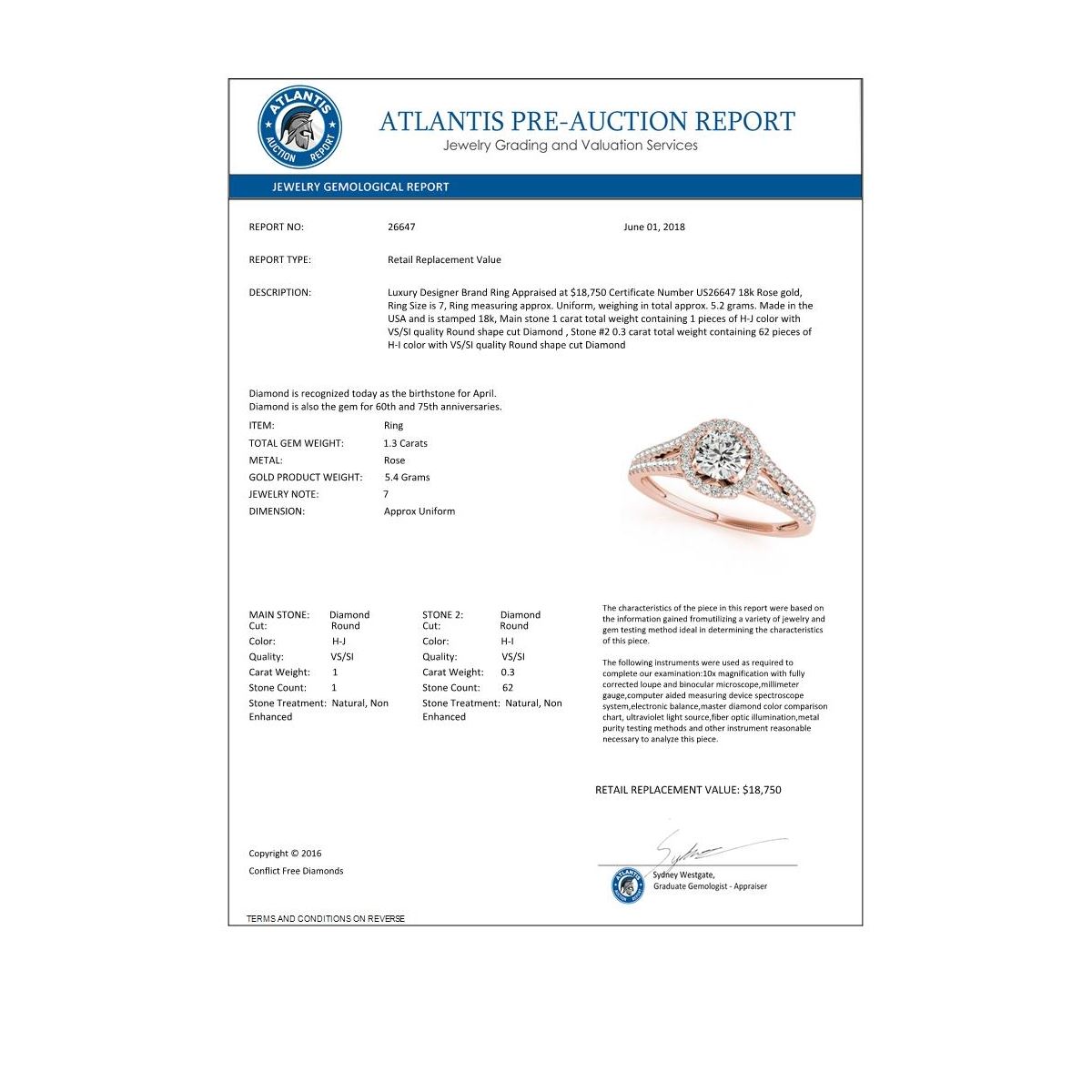 REF-378W8F -26647 ---- 1.3 CTW Certified VS/SI Diamond Solitaire Halo Ring 18K Rose Gold ---- Luxury Designer Brand Ring Appraised at $18,750 Certificate Number US26647 18k Rose gold, Ring Size is 7, Ring measuring approx. Uniform, weighing in total approx. 5.2 grams. Made in the USA and is stamped 18k, Main stone 1 carat total weight containing 1 pieces of H-J color with VS/SI quality Round shape cut Diamond , Stone #2 0.3 carat total weight containing 62 pieces of H-I color with VS/SI quality Round shape cut Diamond