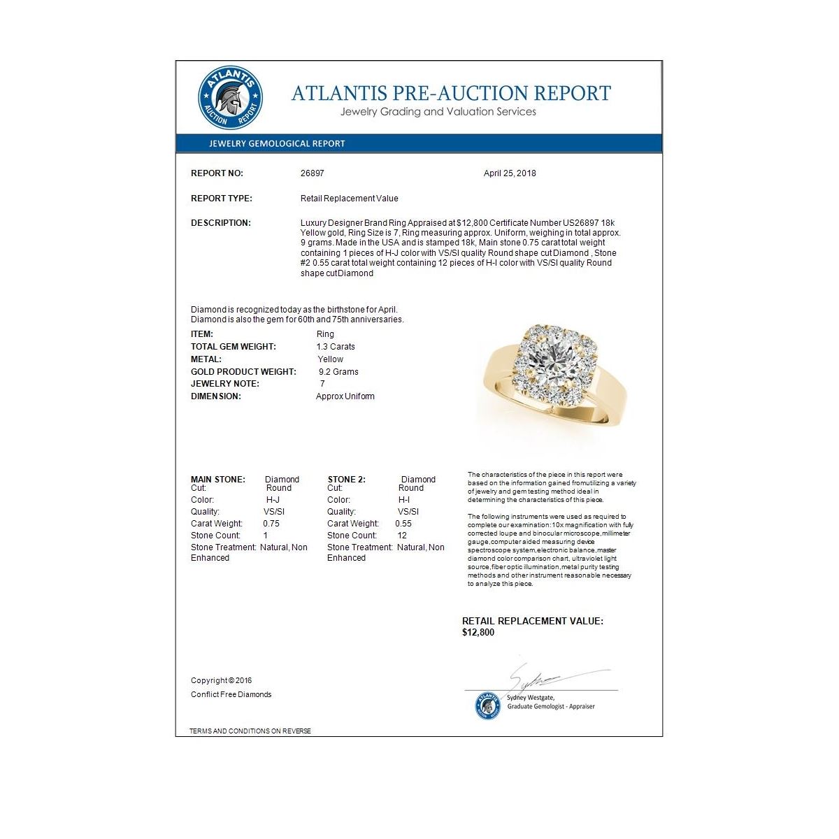 REF-258M8H -26897 ---- 1.3 CTW Certified VS/SI Diamond Solitaire Halo Ring 18K Yellow Gold ---- Luxury Designer Brand Ring Appraised at $12,800 Certificate Number US26897 18k Yellow gold, Ring Size is 7, Ring measuring approx. Uniform, weighing in total approx. 9 grams. Made in the USA and is stamped 18k, Main stone 0.75 carat total weight containing 1 pieces of H-J color with VS/SI quality Round shape cut Diamond , Stone #2 0.55 carat total weight containing 12 pieces of H-I color with VS/SI quality Round shape cut Diamond