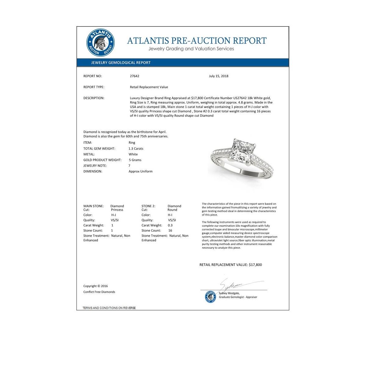 REF-359H5A -27642 ---- 1.3 CTW Certified VS/SI Princess Diamond Solitaire Ring 18K White Gold ---- Luxury Designer Brand Ring Appraised at $17,800 Certificate Number US27642 18k White gold, Ring Size is 7, Ring measuring approx. Uniform, weighing in total approx. 4.8 grams. Made in the USA and is stamped 18k, Main stone 1 carat total weight containing 1 pieces of H-J color with VS/SI quality Princess shape cut Diamond , Stone #2 0.3 carat total weight containing 16 pieces of H-I color with VS/SI quality Round shape cut Diamond