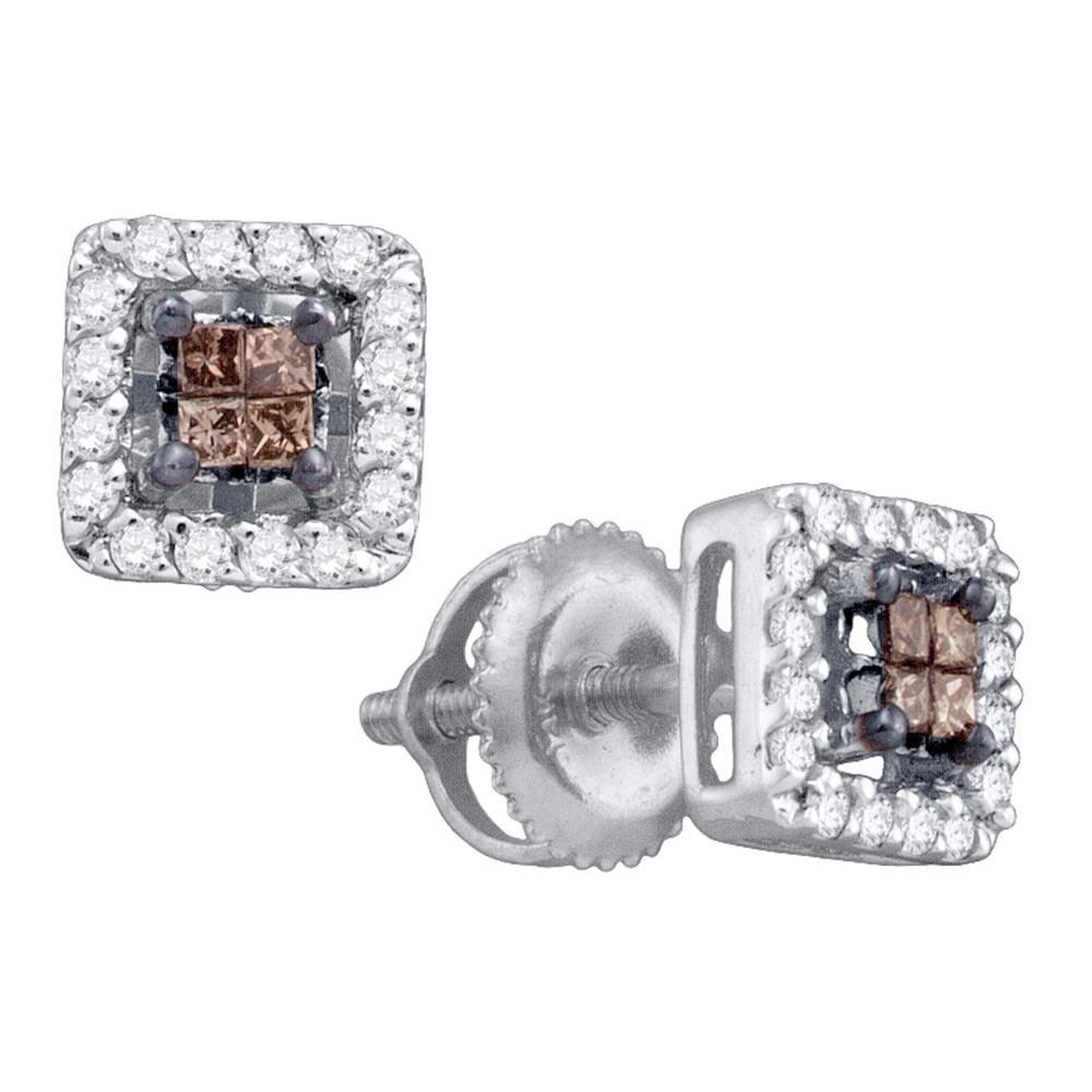 10k White Gold Womens Brown Princess Diamond Stud Square Screwback Earrings 1/3 Cttw