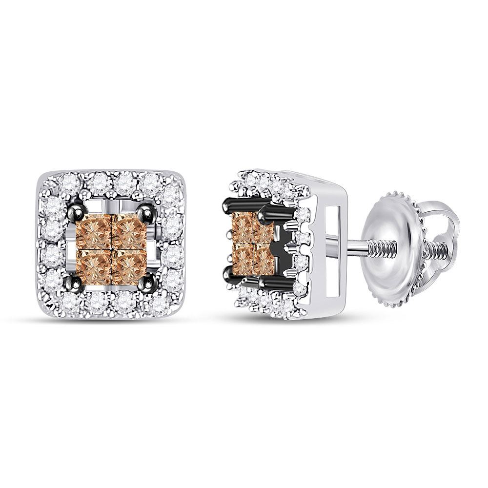 14k White Gold Womens Brown Princess Diamond Stud Square Screwback Earrings 1/3 Cttw