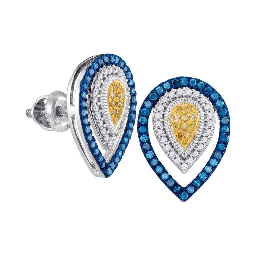 10kt White Gold Womens Round Blue Yellow Color Enhanced Diamond Teardrop Earrings 1/3 Cttw