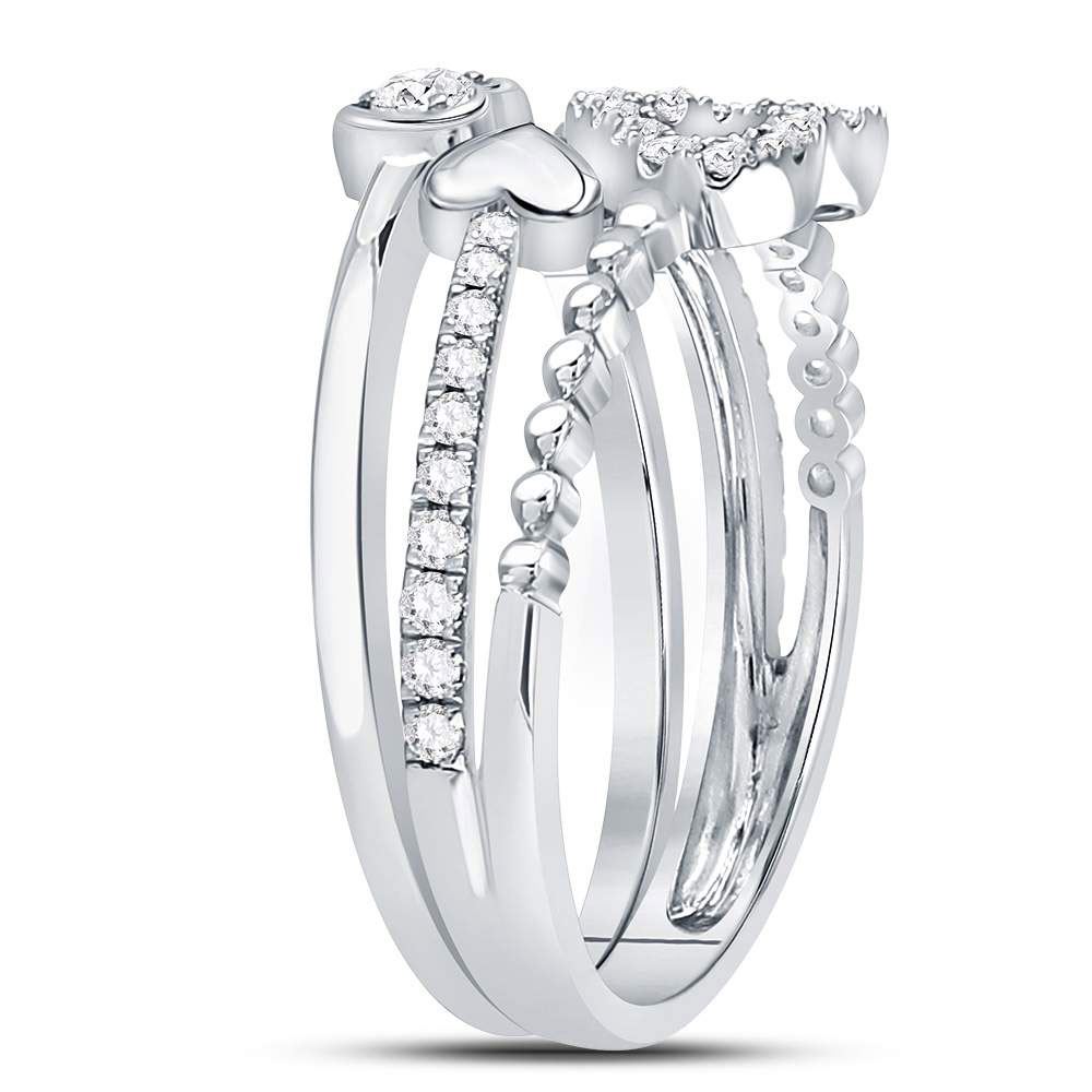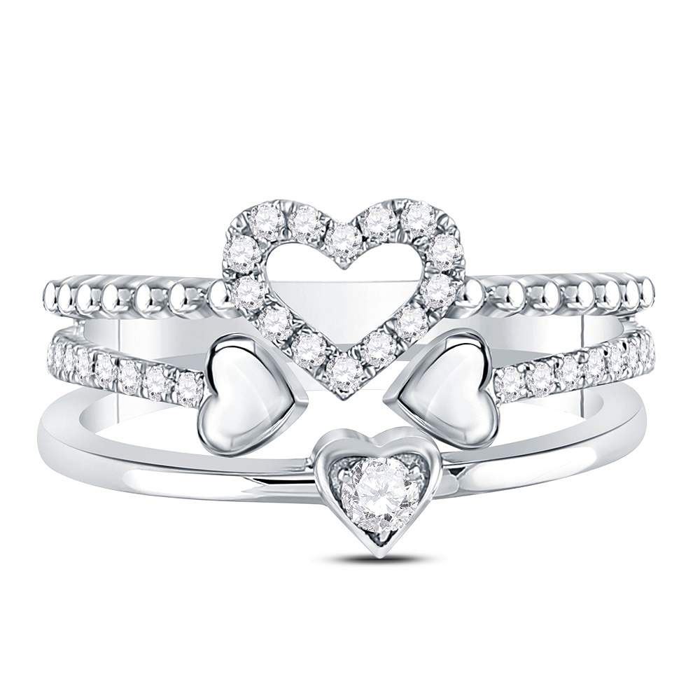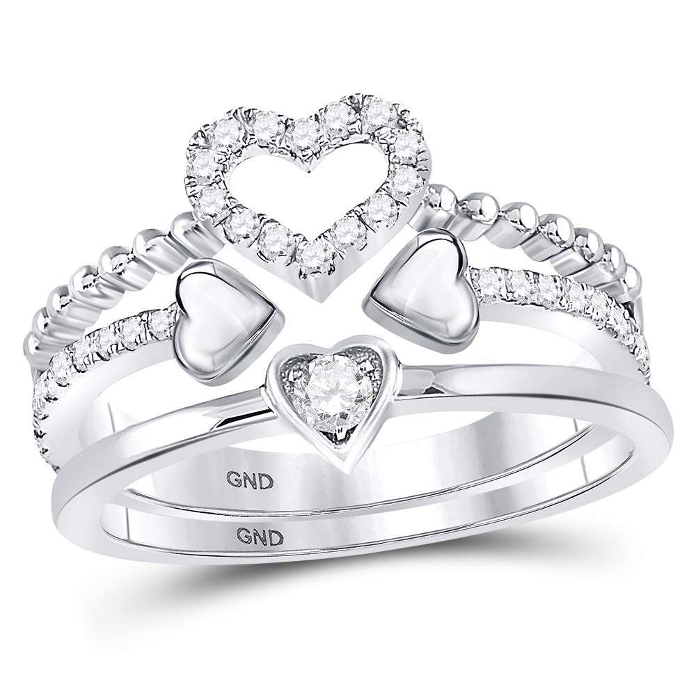 14kt White Gold Womens Round Diamond 2-Piece Beaded Heart Band Ring Set 1/3 Cttw