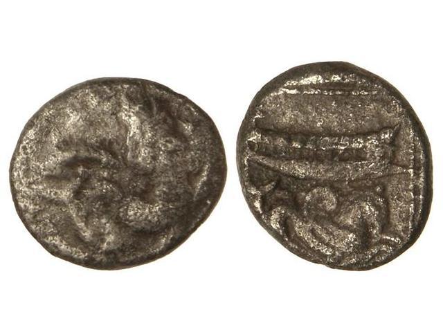1/3 Estátera. - Siglo V a.C. - ARADOS. - Anv.: Sirena a derecha, a izquierda delfín. Rev.: Galera a derecha, debajo hipocampo, dentro de cuadro incuso. 2,90 grs. AR. Pátina oscura. (Oxidaciones). RARA. Se-5968. BC/MBC-. - -