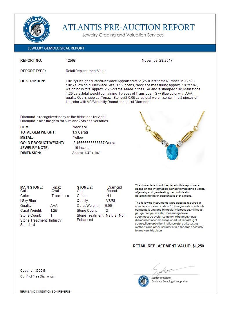 REF-19W3F -12598 ---- 1.30 CTW Blue Topaz & Diamond Necklace 10K Yellow Gold ---- Luxury Designer Brand Necklace Appraised at $1,250 Certificate Number US12598 10k Yellow gold, Necklace Size is 16 Incehs, Necklace measuring approx. 1/4" x 1/4", weighing in total approx. 2.25 grams. Made in the USA and is stamped 10k, Main stone 1.25 carat total weight containing 1 pieces of Translucent Sky Blue color with AAA quality Oval shape cut Topaz , Stone #2 0.05 carat total weight containing 2 pieces of H-I color with VS/SI quality Round shape cut Diamond