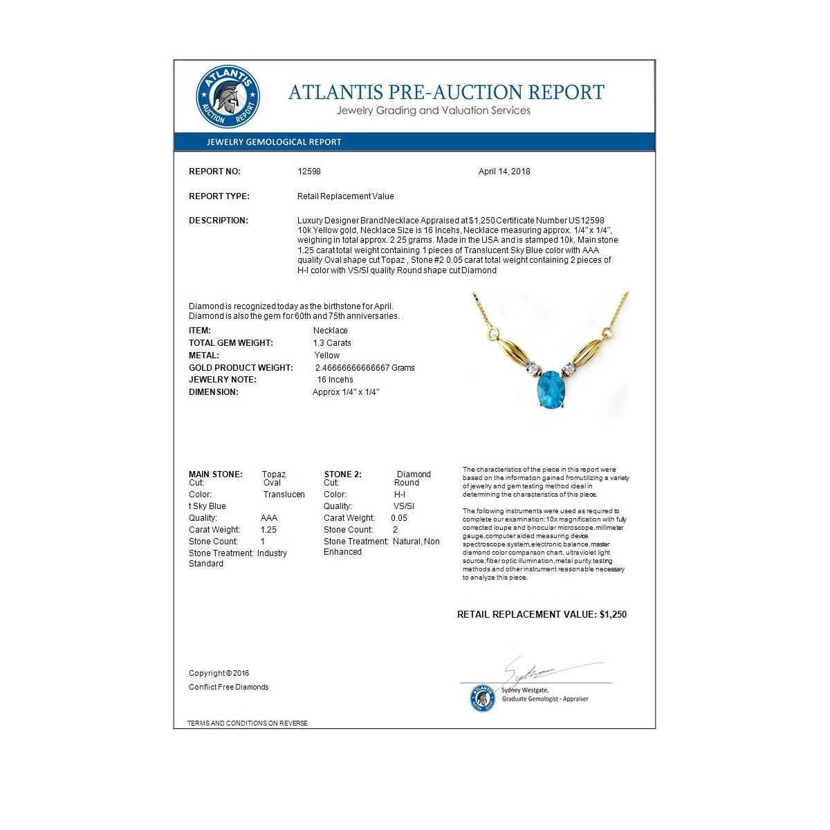 REF-19W3F -12598 ---- 1.30 CTW Blue Topaz & Diamond Necklace 10K Yellow Gold ---- Luxury Designer Brand Necklace Appraised at $1,250 Certificate Number US12598 10k Yellow gold, Necklace Size is 16 Incehs, Necklace measuring approx. 1/4" x 1/4", weighing in total approx. 2.25 grams. Made in the USA and is stamped 10k, Main stone 1.25 carat total weight containing 1 pieces of Translucent Sky Blue color with AAA quality Oval shape cut Topaz , Stone #2 0.05 carat total weight containing 2 pieces of H-I color with VS/SI quality Round shape cut Diamond