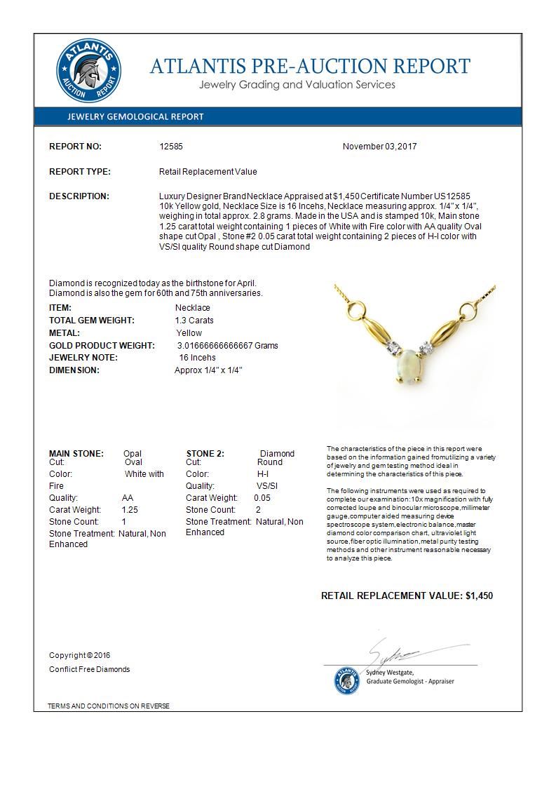 REF-21N6Y -12585 ---- 1.30 CTW Opal & Diamond Necklace 10K Yellow Gold ---- Luxury Designer Brand Necklace Appraised at $1,450 Certificate Number US12585 10k Yellow gold, Necklace Size is 16 Incehs, Necklace measuring approx. 1/4" x 1/4", weighing in total approx. 2.8 grams. Made in the USA and is stamped 10k, Main stone 1.25 carat total weight containing 1 pieces of White with Fire color with AA quality Oval shape cut Opal , Stone #2 0.05 carat total weight containing 2 pieces of H-I color with VS/SI quality Round shape cut Diamond