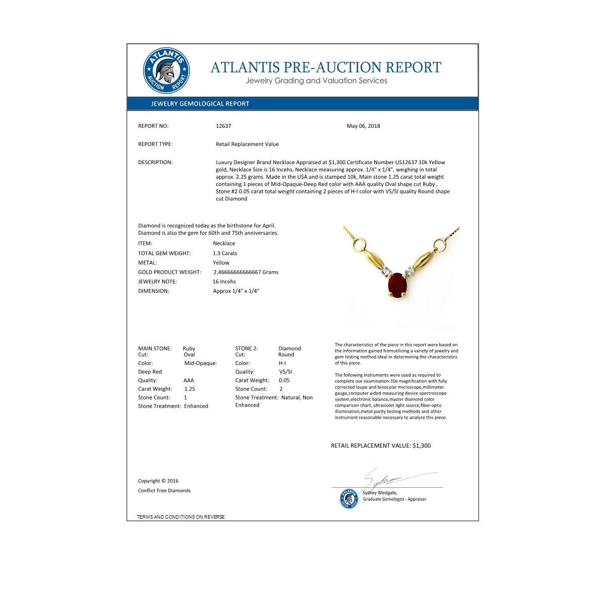 REF-19W8F -12637 ---- 1.30 CTW Ruby & Diamond Necklace 10K Yellow Gold ---- Luxury Designer Brand Necklace Appraised at $1,300 Certificate Number US12637 10k Yellow gold, Necklace Size is 16 Incehs, Necklace measuring approx. 1/4" x 1/4", weighing in total approx. 2.25 grams. Made in the USA and is stamped 10k, Main stone 1.25 carat total weight containing 1 pieces of Mid-Opaque-Deep Red color with AAA quality Oval shape cut Ruby , Stone #2 0.05 carat total weight containing 2 pieces of H-I color with VS/SI quality Round shape cut Diamond