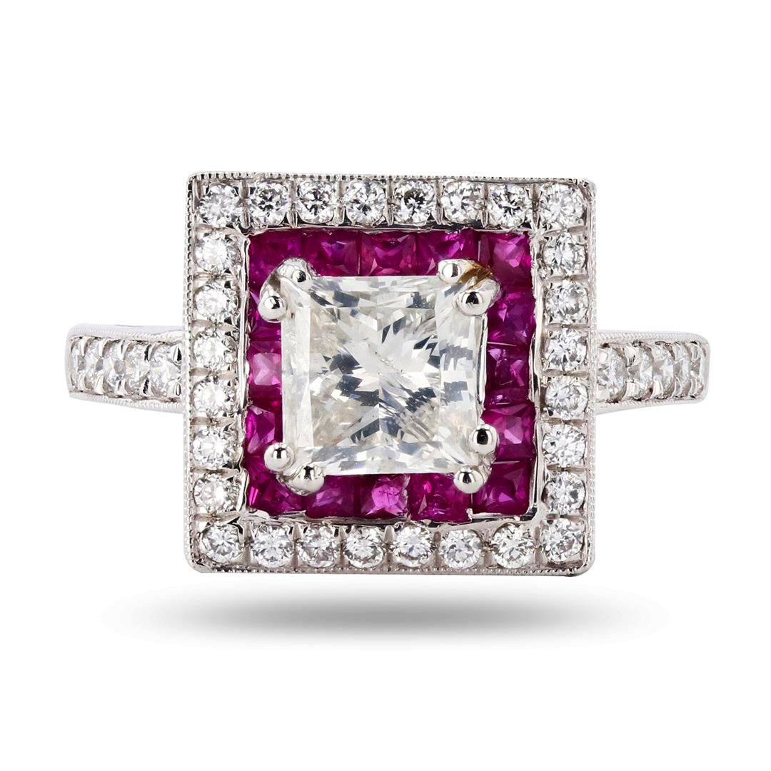 One electronically tested platinum ladies cast diamond & ruby ring. Condition is new, good workmanship. The featured diamond is set within an inner ruby bezel, and an outer diamond bezel, supported by a lattice under gallery and diamond set shoulders, completed by a two millimeter wide band. Trademark is Orianne. Identified with markings of "PT950". Containing: One prong set princess cut diamond, measuring 5.90 x 5.88 x 4.27mm (depth est.), 3.00% GTCF approximate weight of 1.30ct with a medium strong blue fluorescence. Graded in the setting. Clarity I1 Color I Thirty-eight prong set round brilliant cut diamonds, measuring 1.60 - 1.30 x 0.87mm (depth est.) approximate total weight of 38 Stones = 0.42ctw. Graded in the setting. Clarity SI1 to I1 Color H - J Sixteen channel set square princess mixed cut natural rubies, measuring 1.80 x 1.70 x 1.14mm, approximate total weight of 0.68ctw., clarity is slightly included, medium dark, very slightly brownish, strongly purplish red color, (GIA stpR 6/3), cut is good. Transmitting light with no distortion, transparent. Naturally occurring internal & external characteristics are present. Measurements are an average for the group. Graded in the setting. Total Weight of Colored Stones 0.68ctw. Total Weight of Diamonds 1.72ctw. Total Weight of Ring 7.70 gm