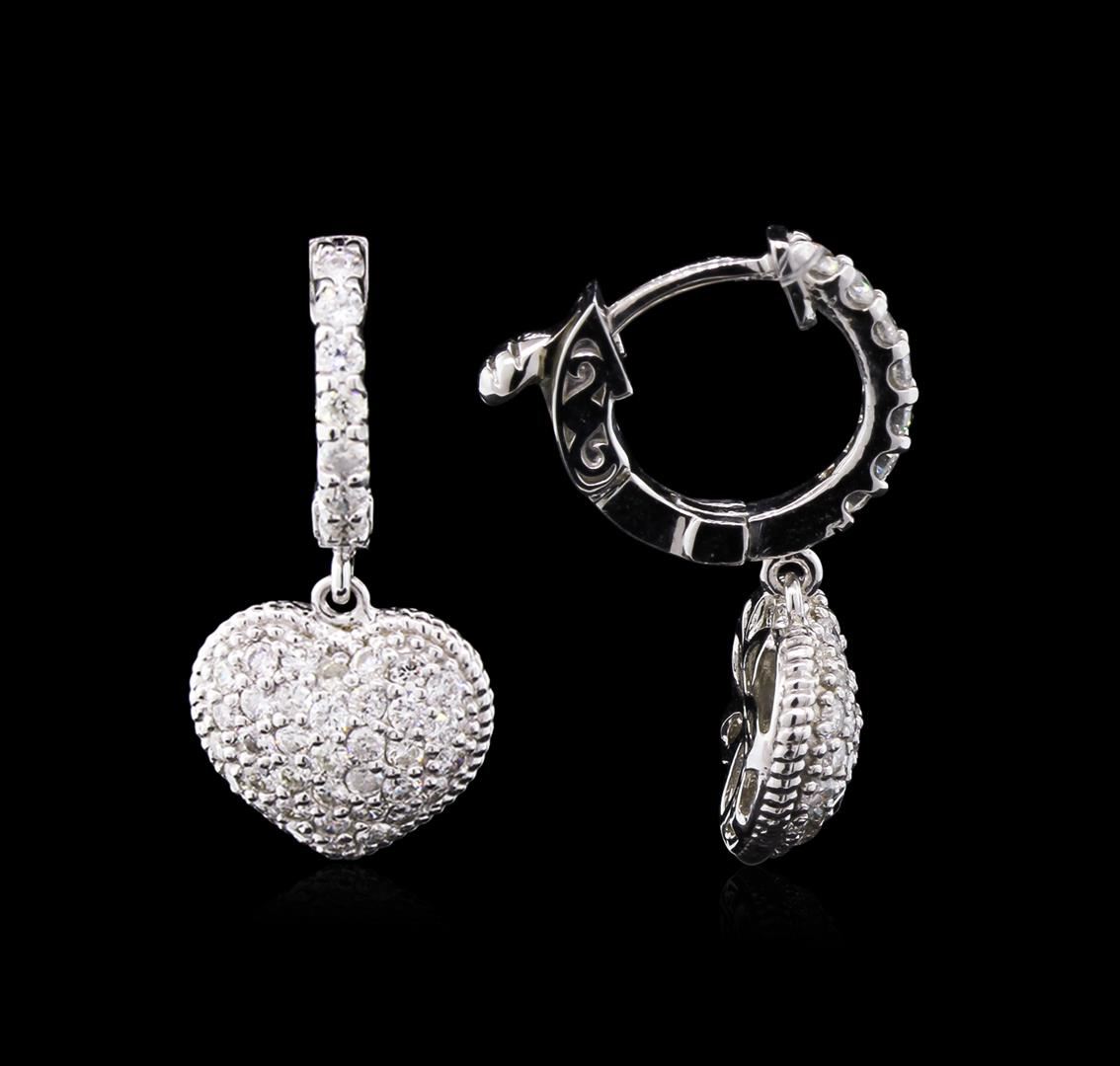 One pair electronically tested 14KT white gold lady's combination cast & assembled heart shape earrings with hinged, snap locking posts with a bright polish finish. Identified with markings of "K14". Condition is new, good workmanship. Containing: Fourteen prong set round brilliant cut diamonds, measuring 1.80 - 1.75 x 1.16mm (depth est.) approximate total weight of 14 Stones = 0.33ct. Graded in the setting. Clarity: SI-1 to SI-2 . Color: H - I. Cut Good Seventy-Four prong set round brilliant cut diamonds, measuring 1.50 - 1.45 x 0.96mm (depth est.) approximate total weight of 74 Stones = 0.97ct. Graded in the setting. Clarity: SI-1 to SI-2 . Color: H - I. Cut Good. Total Weight of Diamonds 1.30ct.. Total Weight of Earrings 5.40gm at $ 4560.00 GAS Appraised.