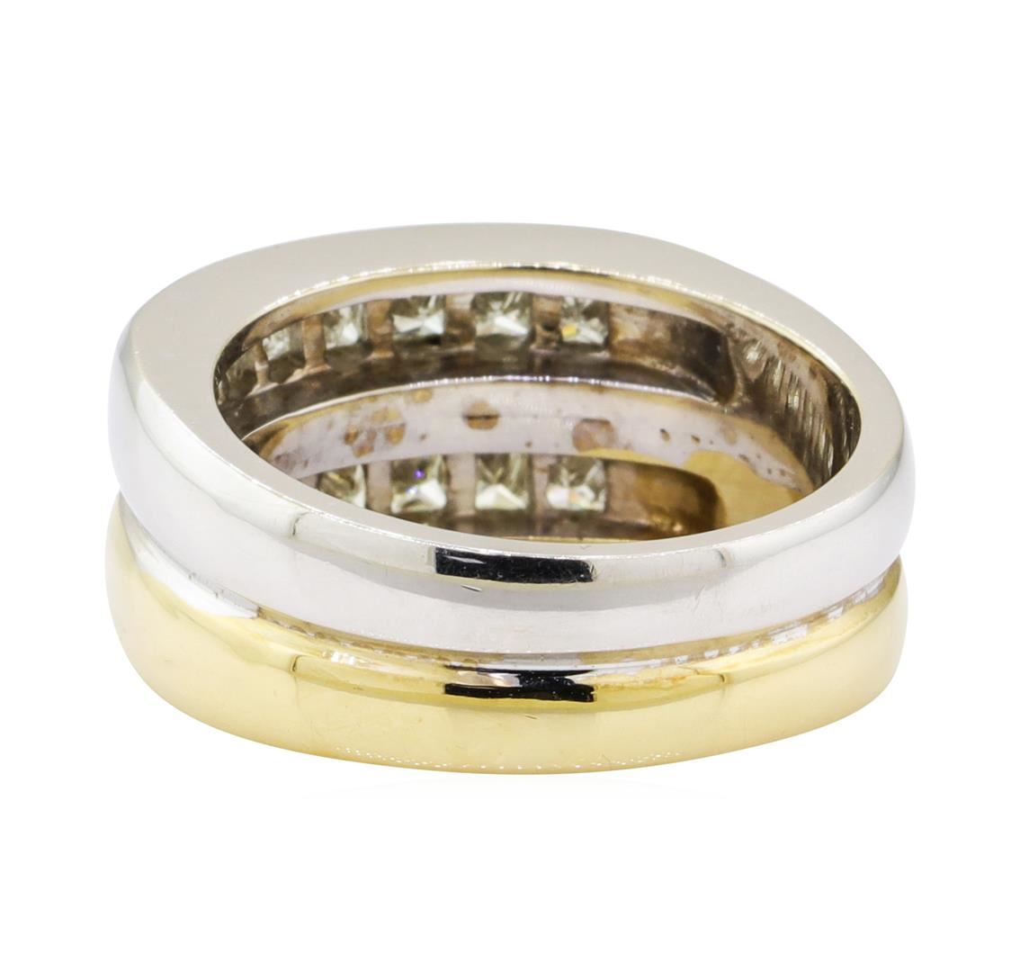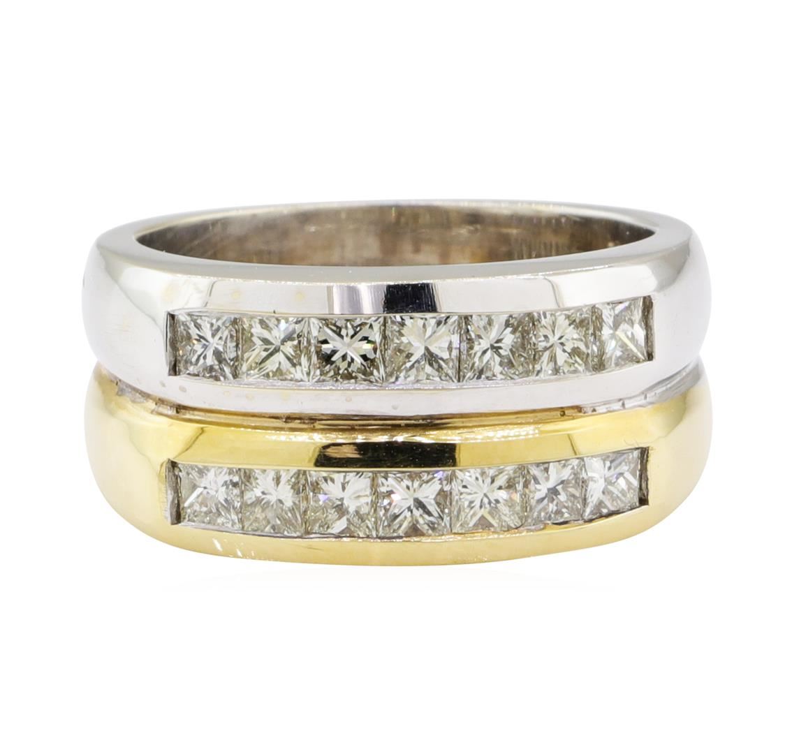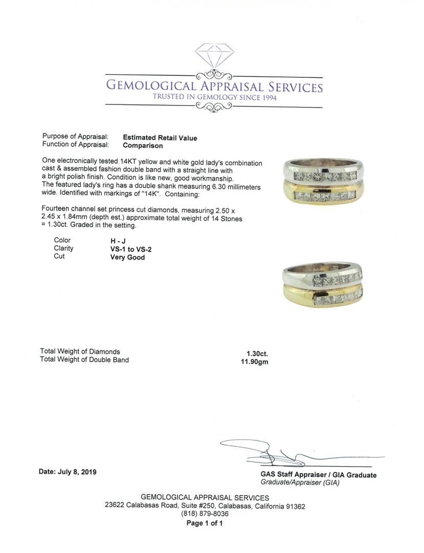 One electronically tested 14KT yellow and white gold lady's combination cast & assembled fashion double band with a straight line with a bright polish finish. The featured lady's ring has a double shank measuring 6.30 millimeters wide. Identified with markings of '14K'. Condition is like new, good workmanship. Containing: Fourteen channel set princess cut diamonds, measuring 2.50 x 2.45 x 1.84mm (depth est.) approximate total weight of 14 Stones = 1.30ct. Graded in the setting. Color H - J Clarity VS-1 to VS-2 Cut Very Good. Total Weight of Diamonds 1.30ct.. Total Weight of Double Band 11.90gm GAS Appraised at $4775.00. GAS Appraised at $4,775.00.