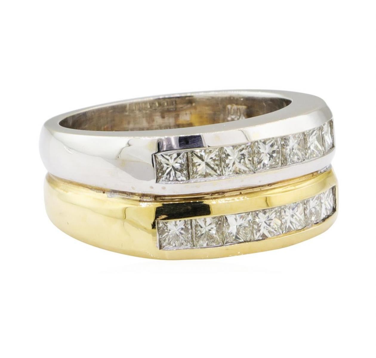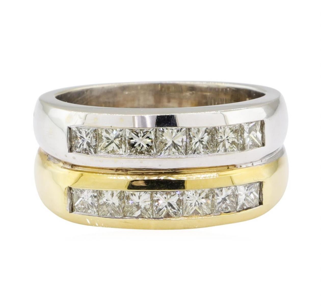 One electronically tested 14KT yellow and white gold lady's combination cast & assembled fashion double band with a straight line with a bright polish finish. The featured lady's ring has a double shank measuring 6.30 millimeters wide. Identified with markings of '14K'. Condition is like new, good workmanship. Containing: Fourteen channel set princess cut diamonds, measuring 2.50 x 2.45 x 1.84mm (depth est.) approximate total weight of 14 Stones = 1.30ct. Graded in the setting. Color H - J Clarity VS-1 to VS-2 Cut Very Good. Total Weight of Diamonds 1.30ct.. Total Weight of Double Band 11.90gm GAS Appraised at $4775.00. GAS Appraised.