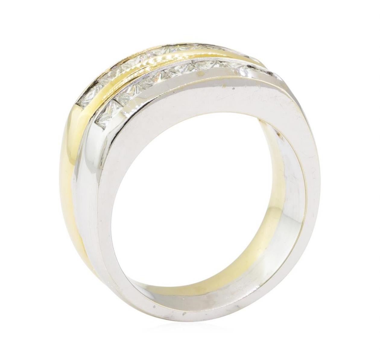 One electronically tested 14KT yellow and white gold lady's combination cast & assembled fashion double band with a straight line with a bright polish finish. The featured lady's ring has a double shank measuring 6.30 millimeters wide. Identified with markings of '14K'. Condition is like new, good workmanship. Containing: Fourteen channel set princess cut diamonds, measuring 2.50 x 2.45 x 1.84mm (depth est.) approximate total weight of 14 Stones = 1.30ct. Graded in the setting. Color H - J Clarity VS-1 to VS-2 Cut Very Good. Total Weight of Diamonds 1.30ct.. Total Weight of Double Band 11.90gm GAS Appraised at $4775.00. GAS Appraised.