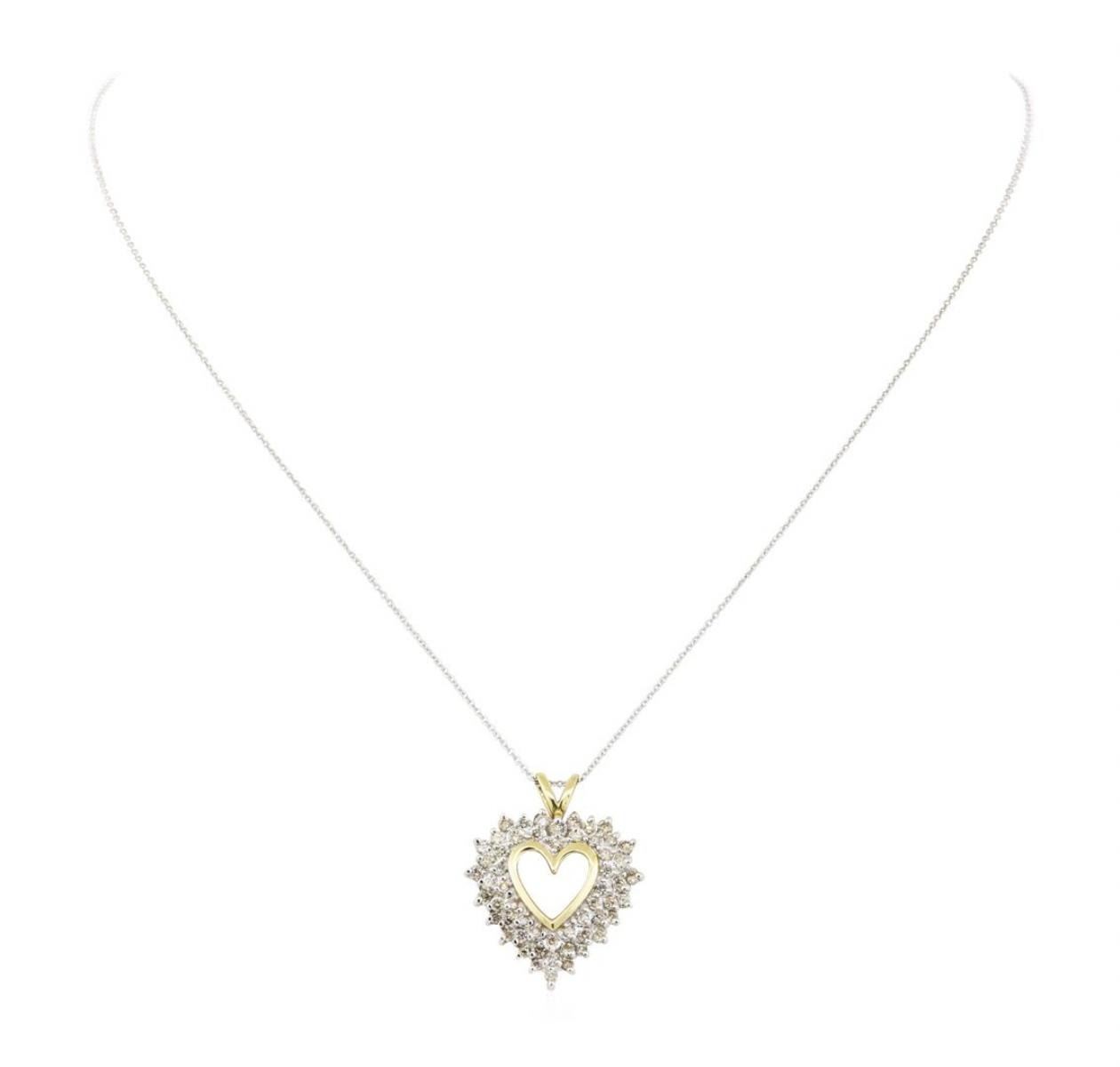 One heart shaped pendant with an attached 16 inch 1mm rounded cable link chain featuring: 14KT yellow and white gold weighing 5.4 grams containing diamonds weighing 1.30ctw.