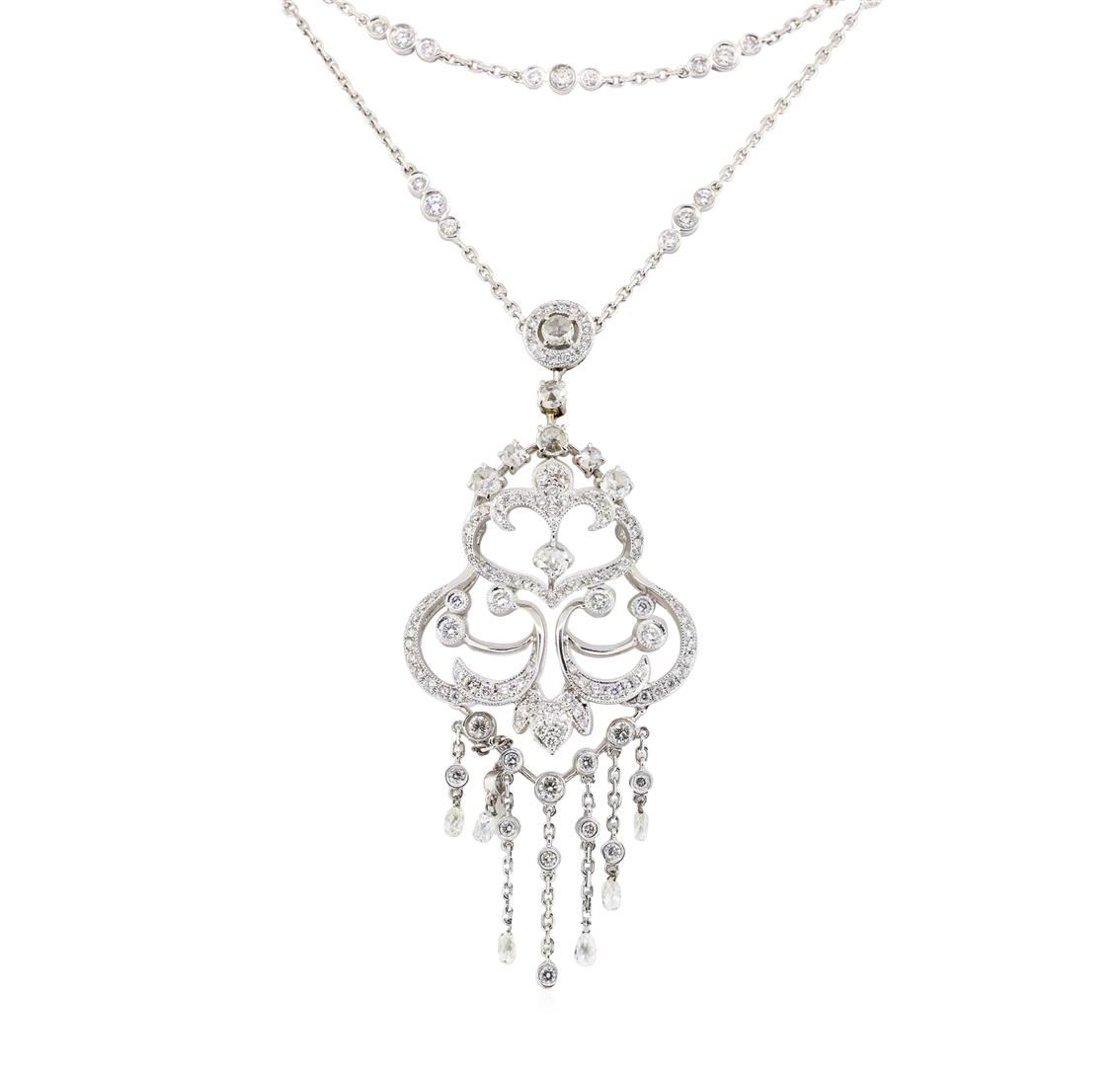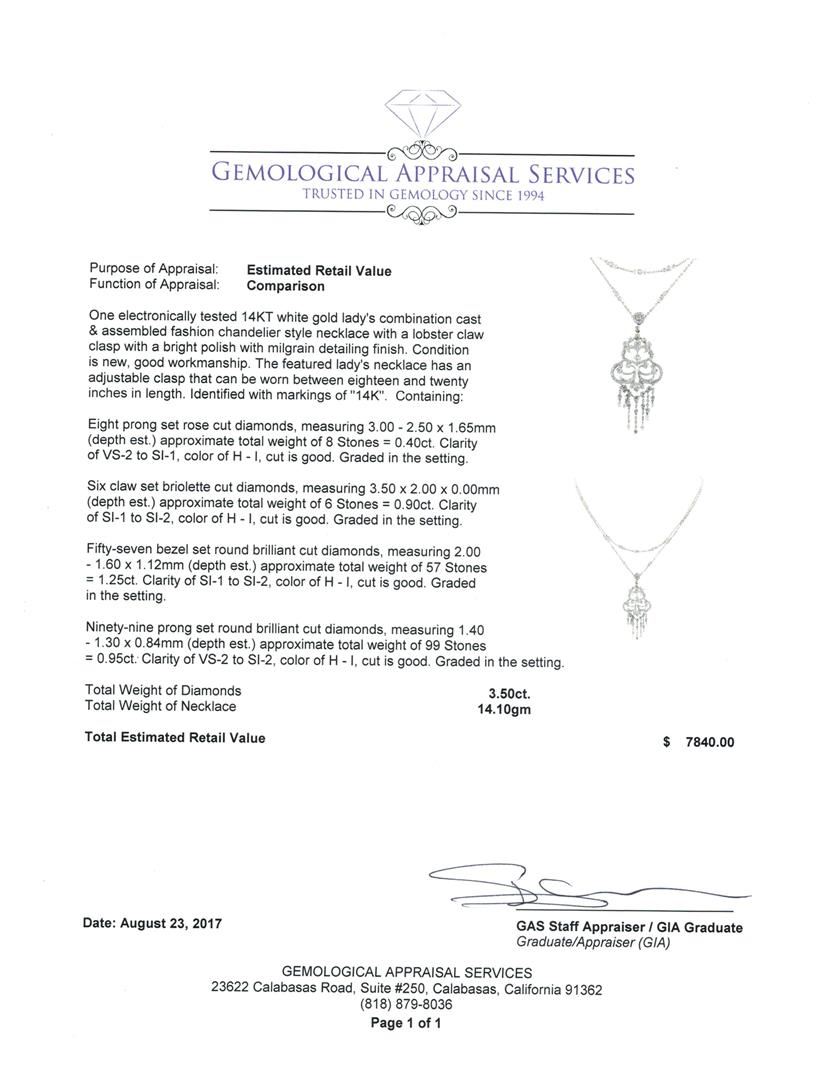 One electronically tested 14KT white gold lady's combination cast & assembled fashion chandelier style necklace with a lobster claw clasp with a bright polish with milgrain detailing finish. The featured lady's necklace has an adjustable clasp that can be worn between eighteen and twenty inches in length. Identified with markings of '14K'. Condition is new, good workmanship. Containing: Eight prong set rose cut diamonds, measuring 3.00 - 2.50 x 1.65mm (depth est.) approximate total weight of 8 Stones = 0.40ct. Graded in the setting. Color H - I Clarity VS-2 to SI-1 Cut Good Six claw set briolette cut diamonds, measuring 3.50 x 2.00 x 0.00mm (depth est.) approximate total weight of 6 Stones = 0.90ct. Graded in the setting. Color H - I Clarity SI-1 to SI-2 Cut Good Fifty-Seven bezel set round brilliant cut diamonds, measuring 2.00 - 1.60 x 1.12mm (depth est.) approximate total weight of 57 Stones = 1.25ct. Graded in the setting. Color H - I Clarity SI-1 to SI-2 Cut Good Ninety-Nine prong set round brilliant cut diamonds, measuring 1.40 - 1.30 x 0.84mm (depth est.) approximate total weight of 99 Stones = 0.95ct. Graded in the setting. Color H - I Clarity VS-2 to SI-2 Cut Good. Total Weight of Diamonds 3.50ct.. Total Weight of Necklace 14.10gm GAS Appraised at $7840.00. GAS Appraised.