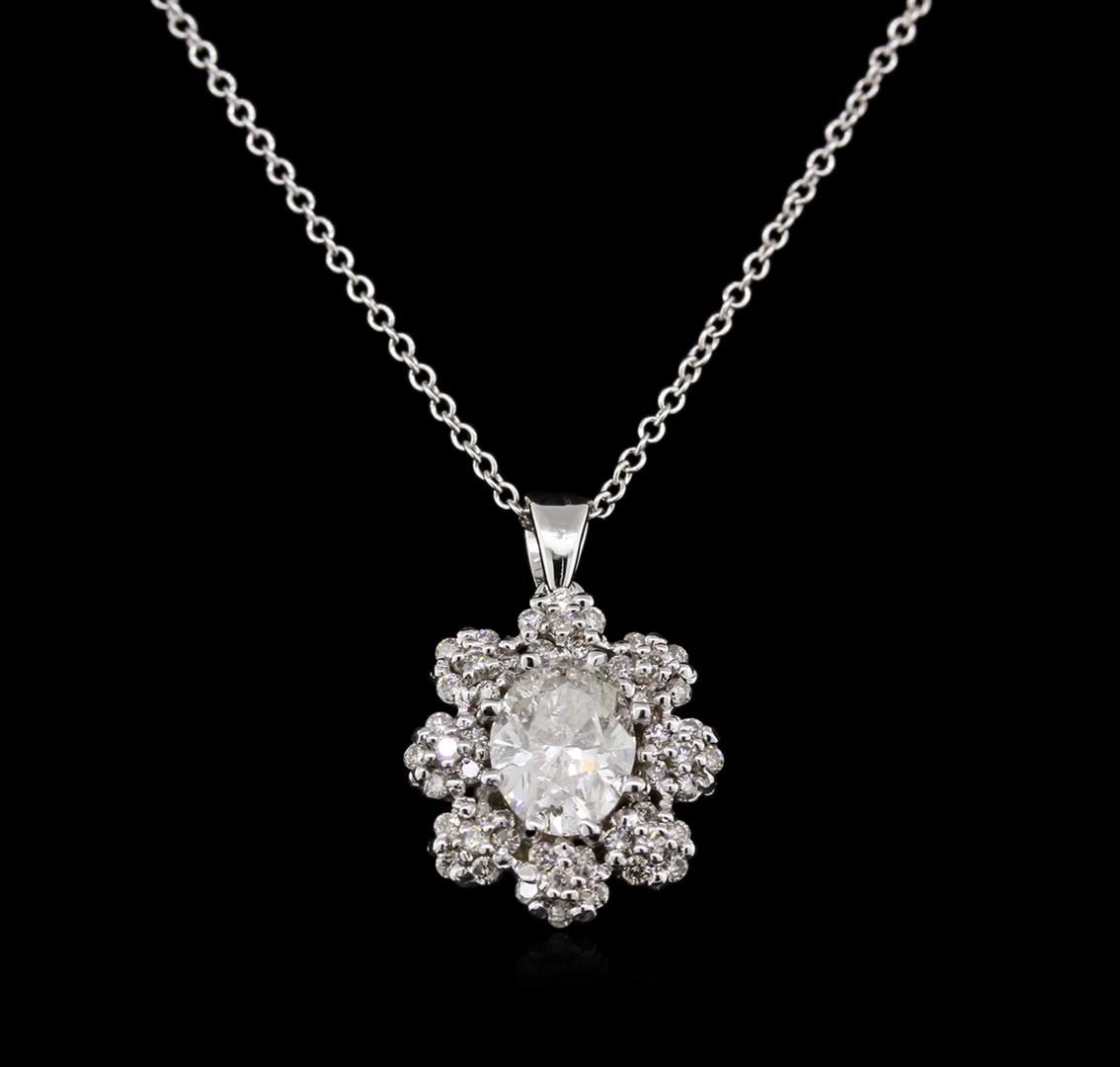 One electronically tested 14KT white gold lady's combination cast & assembled fashion pendant & chain 18.0" long, 1mm round cable link with a spring ring clasp with a bright polish finish. Identified with markings of "14K". Condition is new, good workmanship. Containing: One prong set oval shaped cut diamond, measuring 7.15 x 5.88 x 3.70mm (depth est.) approximate weight of 1.00ct. Graded in the setting. Clarity: I-1. Color: I - Good Forty-Eight prong set round brilliant cut diamonds, measuring 1.20 - 1.15 x 0.74mm (depth est.) approximate total weight of 48 Stones = 0.30ct. Graded in the setting. Clarity: SI-1 to I-1. Color: H - I. Cut Good. Total Weight of Diamonds 1.30ct. Total Weight of Pendant & Chain 3.20gm. GAS Appraised at $7,850.00.