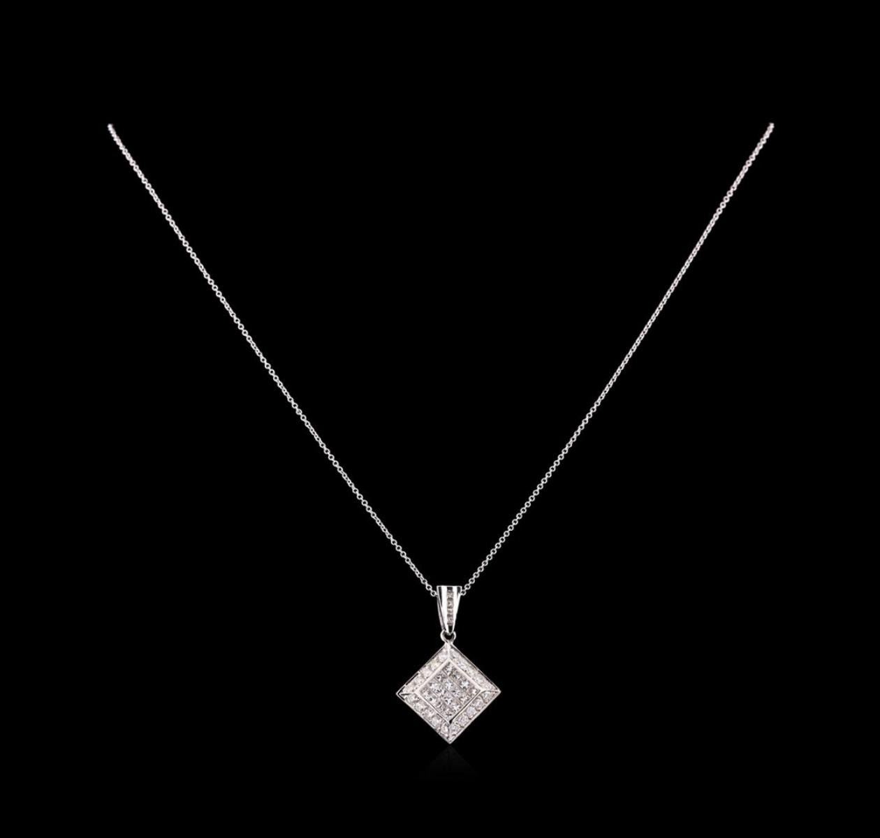 One electronically tested 14KT white gold ladies cast & assembled diamond pendant with chain. The pendant features a princess cut diamond gallery set within a diamond bezel, completed by a diamond ribbon bail. The pendant is supported by a sixteen inch length 14KT white gold cable chain, terminating in a spring ring clasp. Bright polish finish. Identified with markings of '14K'. Condition is good. Containing: Twenty invisible set princess cut diamonds (depth est.) approximate total weight of 20 Stones = 0.80ct. Graded in the setting. Clarity SI-1 to I-1. Color: F - H Twenty prong set round brilliant cut diamonds, measuring 2.00 - 1.90 x 1.17mm (depth est.) approximate total weight of 20 Stones = 0.50ct. The color and clarity grades reflect the entire ranges of color and clarity for this group. Graded in the setting. Clarity SI-1 to I-2. Color: F - I. Total Weight of Diamonds 1.30ct.. Total Weight of Pendant With Chain 3.55gm. AIG Appraised.