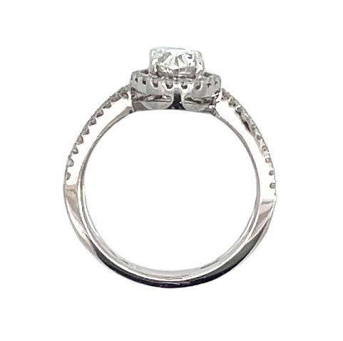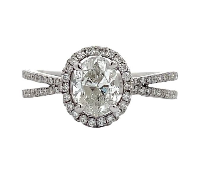 One electronically tested 14KT white gold lady's cast oval halo wedding ring with a reverse split shank with a bright polish finish. The featured lady's ring has a shank measuring 3.00 millimeters wide. Identified with markings of "14K". Condition is new, good workmanship. Containing: One prong set oval shaped cut diamond, measuring 7.28 x 5.63 x 3.55mm (depth est.) , 6.00% GTCF approximate weight of 1.00ct. Graded in the setting. Color I Clarity SI-3 Cut Good Sixty-Two prong set round brilliant cut diamonds, measuring 1.10 - 1.05 x 0.67mm (depth est.) approximate total weight of 62 Stones = 0.30ct. Graded in the setting. Color H - I Clarity SI-1 to SI-2 Cut Very Good Total Weight of Diamonds 1.30ct. Total Weight of Wedding Ring 3.40gm