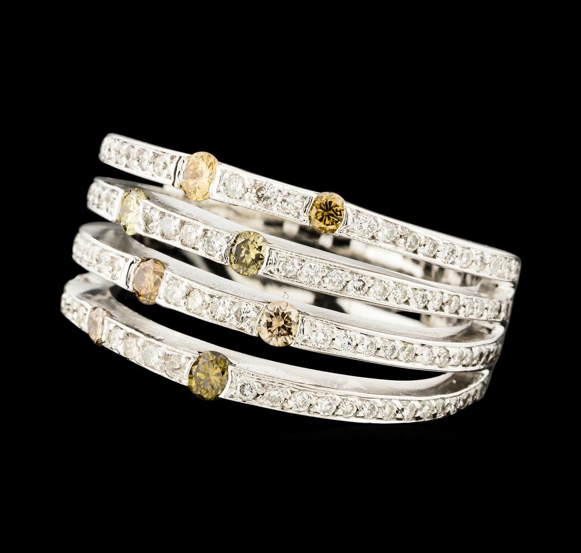 One electronically tested 14KT white gold lady's cast fashion ring with a four row split tapered shank with a bright polish finish. The featured lady's ring has a shank measuring 5.60 millimeters wide. Identified with markings of '14K'. Condition is new, good workmanship. Containing: Eight channel set round brilliant cut diamonds, measuring 2.50 - 2.00 x 1.40mm (depth est.) approximate total weight of 8 Stones = 0.40ct. The featured diamonds have a yellowish brown hue. Colored gemstones are presumed to have been subjected to commonly used enhancement processes. Graded in the setting. Clarity SI-1 to SI-2 Cut Good One Hundred Sixteen prong set round brilliant cut diamonds, measuring 1.30 - 1.10 x 0.74mm (depth est.) approximate total weight of 116 Stones = 0.90ct. Graded in the setting. Clarity VS-2 to SI-1. Color: G - H Cut Good. Total Weight of Diamonds 1.30ct.. Total Weight of Ring 9.90gm. GAS Appraised at $4,825.00.