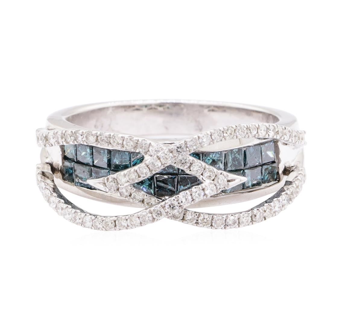 One electronically tested 14KT white gold lady's combination cast & assembled fashion ring with a tapered shank with a bright polish finish. The featured lady's ring has geometric overlay and a shank measuring 3.00 millimeters wide. Identified with markings of '14K'. Condition is new, good workmanship. Containing: Twenty-Two invisible set princess cut diamonds, measuring 2.00 x 1.90 x 1.43mm (depth est.) approximate total weight of 22 Stones = 1.00ct. Colored gemstones are presumed to have been subjected to commonly used enhancement processes. Graded in the setting. Color Fancy Dark Greenish Blue Clarity SI-1 to I-1 Cut Very Good Seventy-Four prong set round brilliant cut diamonds, measuring 1.10 - 1.00 x 0.63mm (depth est.) approximate total weight of 74 Stones = 0.30ct. Graded in the setting. Color G - I Clarity SI-2 to I-1 Cut Good. Total Weight of Diamonds 1.30ct.. Total Weight of Ring 5.60gm GAS Appraised at $3120.00. GAS Appraised at $3,120.00.