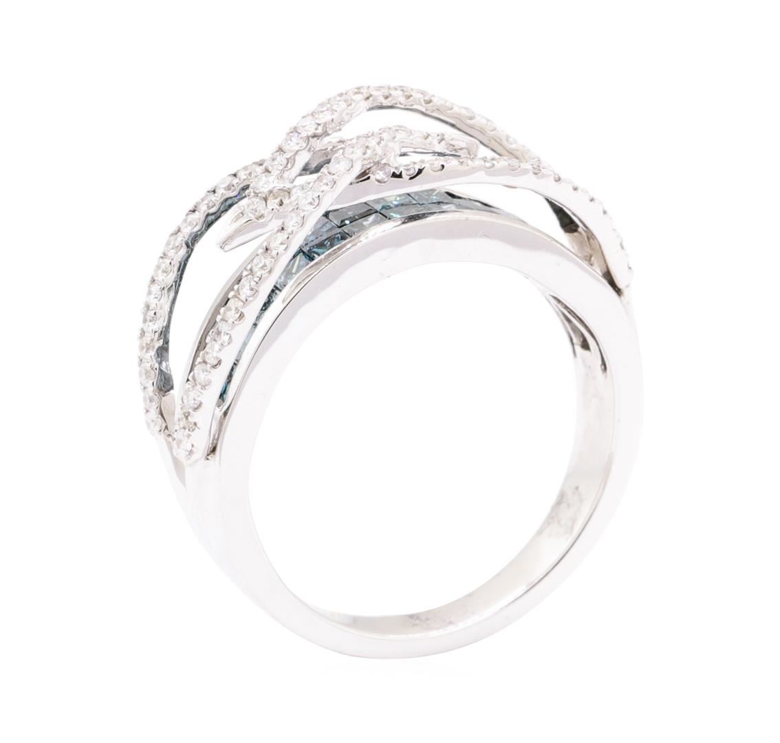 One electronically tested 14KT white gold lady's combination cast & assembled fashion ring with a tapered shank with a bright polish finish. The featured lady's ring has geometric overlay and a shank measuring 3.00 millimeters wide. Identified with markings of '14K'. Condition is new, good workmanship. Containing: Twenty-Two invisible set princess cut diamonds, measuring 2.00 x 1.90 x 1.43mm (depth est.) approximate total weight of 22 Stones = 1.00ct. Colored gemstones are presumed to have been subjected to commonly used enhancement processes. Graded in the setting. Color Fancy Dark Greenish Blue Clarity SI-1 to I-1 Cut Very Good Seventy-Four prong set round brilliant cut diamonds, measuring 1.10 - 1.00 x 0.63mm (depth est.) approximate total weight of 74 Stones = 0.30ct. Graded in the setting. Color G - I Clarity SI-2 to I-1 Cut Good. Total Weight of Diamonds 1.30ct.. Total Weight of Ring 5.60gm GAS Appraised at $3120.00. GAS Appraised at $3,120.00.