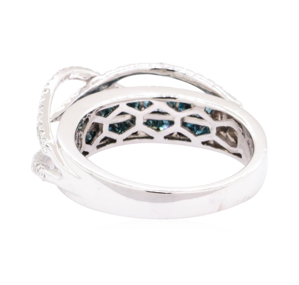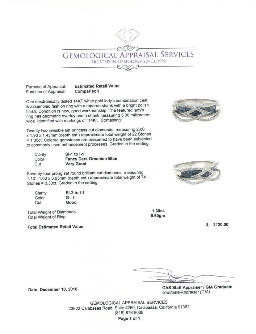 One electronically tested 14KT white gold lady's combination cast & assembled fashion ring with a tapered shank with a bright polish finish. The featured lady's ring has geometric overlay and a shank measuring 3.00 millimeters wide. Identified with markings of '14K'. Condition is new, good workmanship. Containing: Twenty-Two invisible set princess cut diamonds, measuring 2.00 x 1.90 x 1.43mm (depth est.) approximate total weight of 22 Stones = 1.00ct. Colored gemstones are presumed to have been subjected to commonly used enhancement processes. Graded in the setting. Color Fancy Dark Greenish Blue Clarity SI-1 to I-1 Cut Very Good Seventy-Four prong set round brilliant cut diamonds, measuring 1.10 - 1.00 x 0.63mm (depth est.) approximate total weight of 74 Stones = 0.30ct. Graded in the setting. Color G - I Clarity SI-2 to I-1 Cut Good. Total Weight of Diamonds 1.30ct.. Total Weight of Ring 5.60gm GAS Appraised at $3120.00. GAS Appraised at $3,120.00.