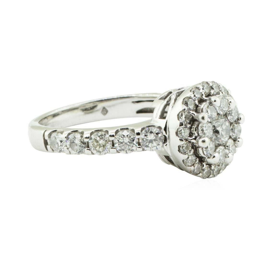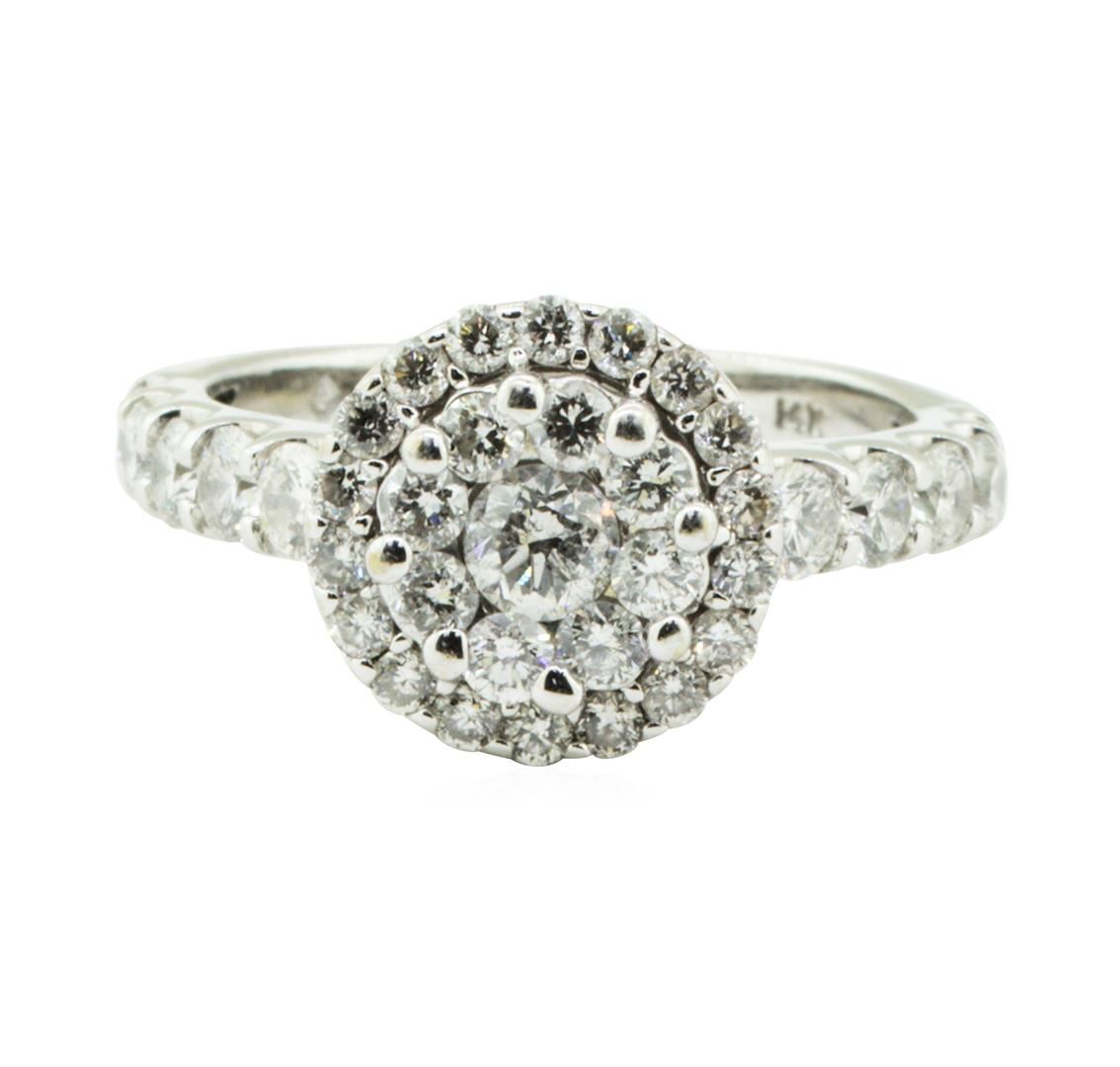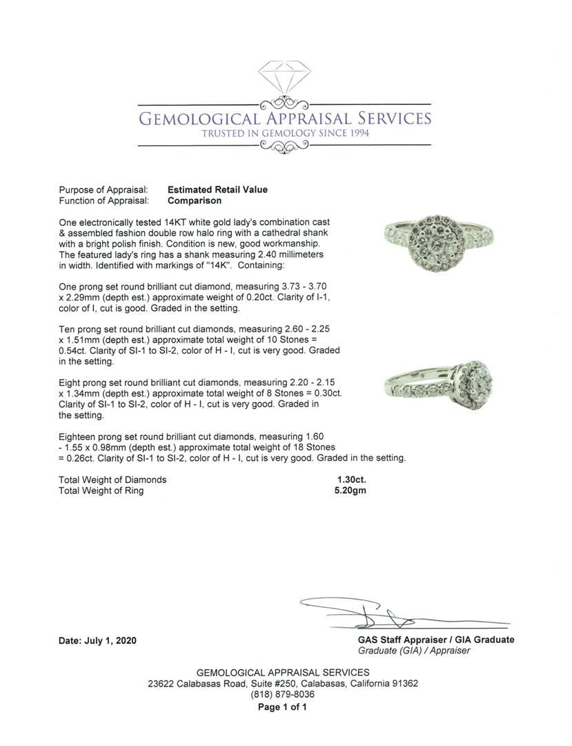One electronically tested 14KT white gold lady's combination cast & assembled fashion double row halo ring with a cathedral shank with a bright polish finish. The featured lady's ring has a shank measuring 2.40 millimeters in width. Identified with markings of '14K'. Condition is new, good workmanship. Containing: One prong set round brilliant cut diamond, measuring 3.73 - 3.70 x 2.29mm (depth est.) approximate weight of 0.20ct. Graded in the setting. Color I Clarity I-1 Cut Good Ten prong set round brilliant cut diamonds, measuring 2.60 - 2.25 x 1.51mm (depth est.) approximate total weight of 10 Stones = 0.54ct. Graded in the setting. Color H - I Clarity SI-1 to SI-2 Cut Very Good Eight prong set round brilliant cut diamonds, measuring 2.20 - 2.15 x 1.34mm (depth est.) approximate total weight of 8 Stones = 0.30ct. Graded in the setting. Color H - I Clarity SI-1 to SI-2 Cut Very Good Eighteen prong set round brilliant cut diamonds, measuring 1.60 - 1.55 x 0.98mm (depth est.) approximate total weight of 18 Stones = 0.26ct. Graded in the setting. Color H - I Clarity SI-1 to SI-2 Cut Very Good. Total Weight of Diamonds 1.30ct.. Total Weight of Ring 5.20gm GAS Appraised at $4100.00. GAS Appraised.