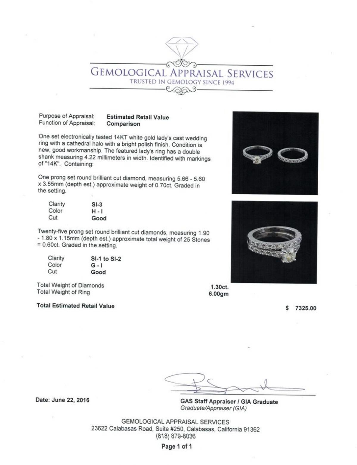 One set electronically tested 14KT white gold lady's cast wedding ring with a cathedral halo with a bright polish finish. The featured lady's ring has a double shank measuring 4.22 millimeters in width. Identified with markings of "14K". Condition is new, good workmanship. Containing: One prong set round brilliant cut diamond, measuring 5.66 - 5.60 x 3.55mm (depth est.) approximate weight of 0.70 ct. Graded in the setting. Clarity: SI-3. Color: H - I. Cut Good Twenty-Five prong set round brilliant cut diamonds, measuring 1.90 - 1.80 x 1.15mm (depth est.) approximate total weight of 25 Stones = 0.60 ct. Graded in the setting. Clarity: SI-1 to SI-2. Color: G - I. Cut Good. Total Weight of Diamonds 1.30 ct. Total Weight of Ring 6.00gm. GAS Appraised.