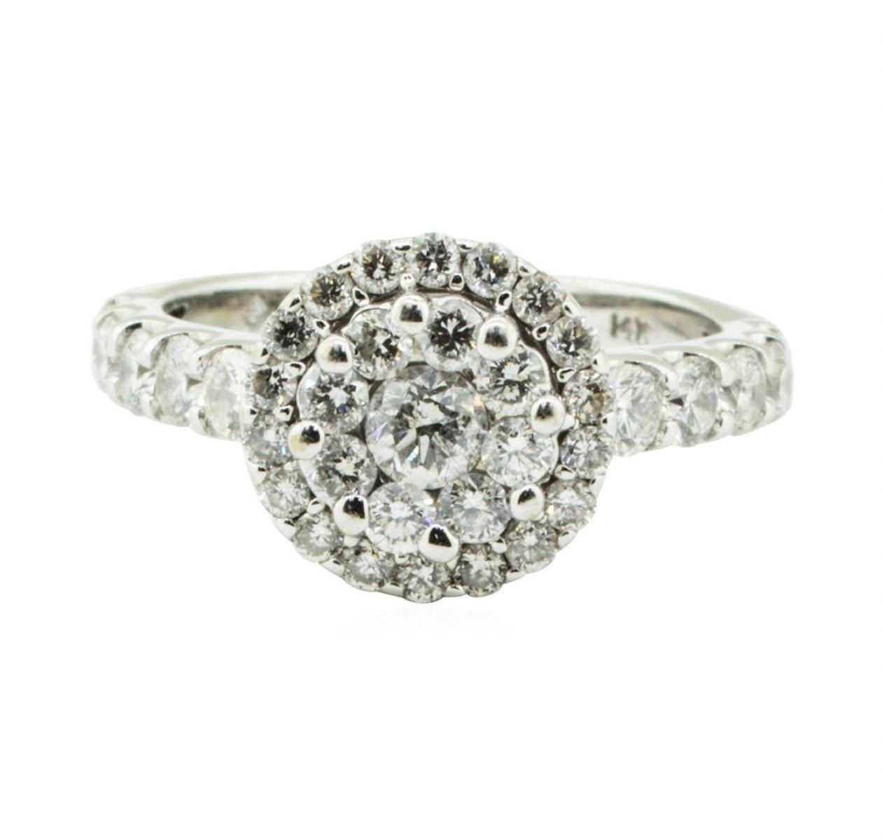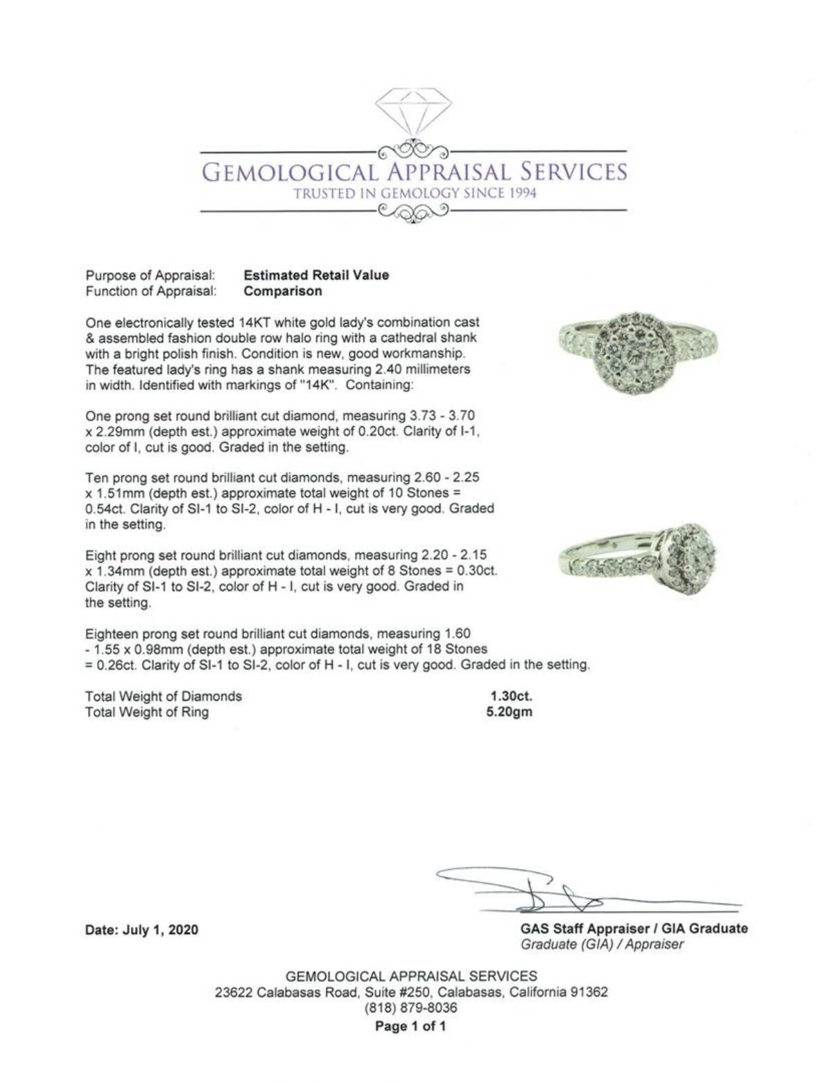 One electronically tested 14KT white gold lady's combination cast & assembled fashion double row halo ring with a cathedral shank with a bright polish finish. The featured lady's ring has a shank measuring 2.40 millimeters in width. Identified with markings of '14K'. Condition is new, good workmanship. Containing: One prong set round brilliant cut diamond, measuring 3.73 - 3.70 x 2.29mm (depth est.) approximate weight of 0.20 ct. Graded in the setting. Color I Clarity I-1 Cut Good Ten prong set round brilliant cut diamonds, measuring 2.60 - 2.25 x 1.51mm (depth est.) approximate total weight of 10 Stones = 0.54ct. Graded in the setting. Color H - I Clarity SI-1 to SI-2 Cut Very Good Eight prong set round brilliant cut diamonds, measuring 2.20 - 2.15 x 1.34mm (depth est.) approximate total weight of 8 Stones = 0.30 ct. Graded in the setting. Color H - I Clarity SI-1 to SI-2 Cut Very Good Eighteen prong set round brilliant cut diamonds, measuring 1.60 - 1.55 x 0.98mm (depth est.) approximate total weight of 18 Stones = 0.26ct. Graded in the setting. Color H - I Clarity SI-1 to SI-2 Cut Very Good. Total Weight of Diamonds 1.30 ct.. Total Weight of Ring 5.20gm GAS Appraised at $4100.00. GAS Appraised.