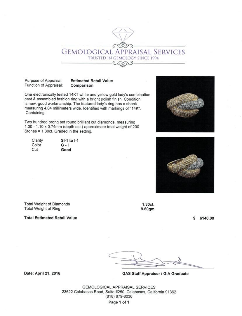 One electronically tested 14KT white and yellow gold lady's combination cast & assembled fashion ring with a bright polish finish. The featured lady's ring has a shank measuring 4.04 millimeters wide. Identified with markings of "14K". Condition is new, good workmanship. Containing: Two Hundred prong set round brilliant cut diamonds, measuring 1.30 - 1.10 x 0.74mm (depth est.) approximate total weight of 200 Stones = 1.30ct. Graded in the setting. Clarity: SI-1 to I-1. Color: G - I. Cut Good. Total Weight of Diamonds 1.30ct. Total Weight of Ring 9.60gm. GAS Appraised at $6,140.00.
