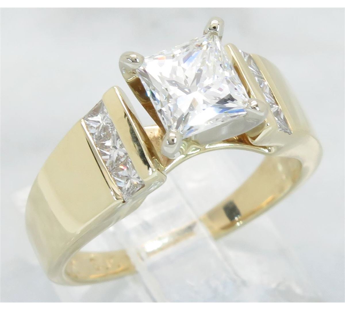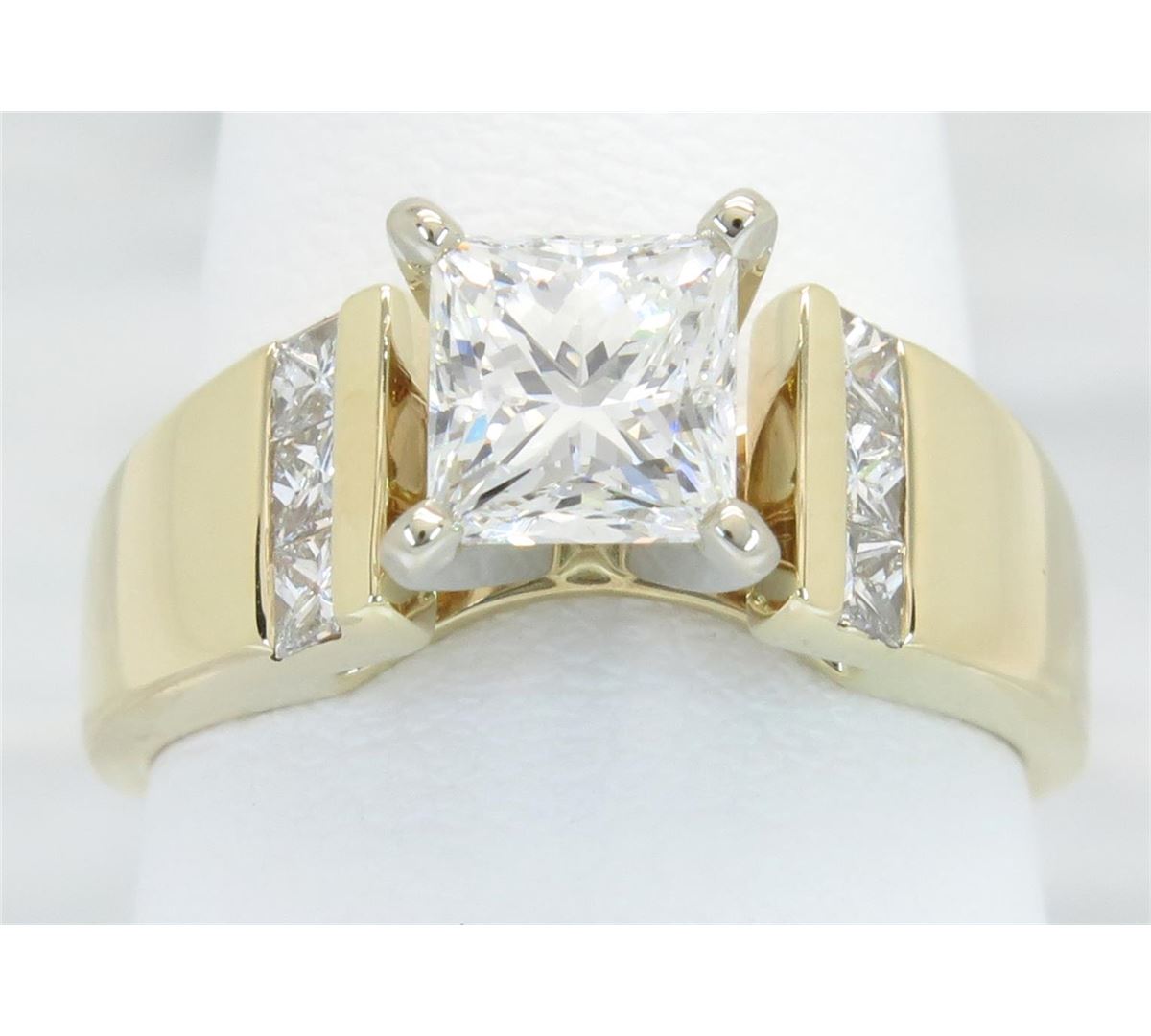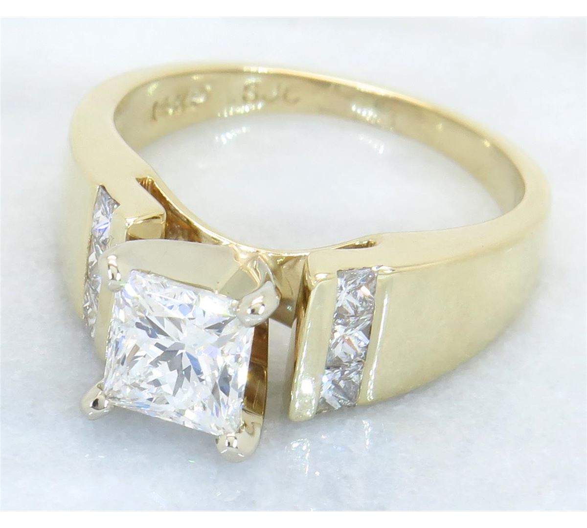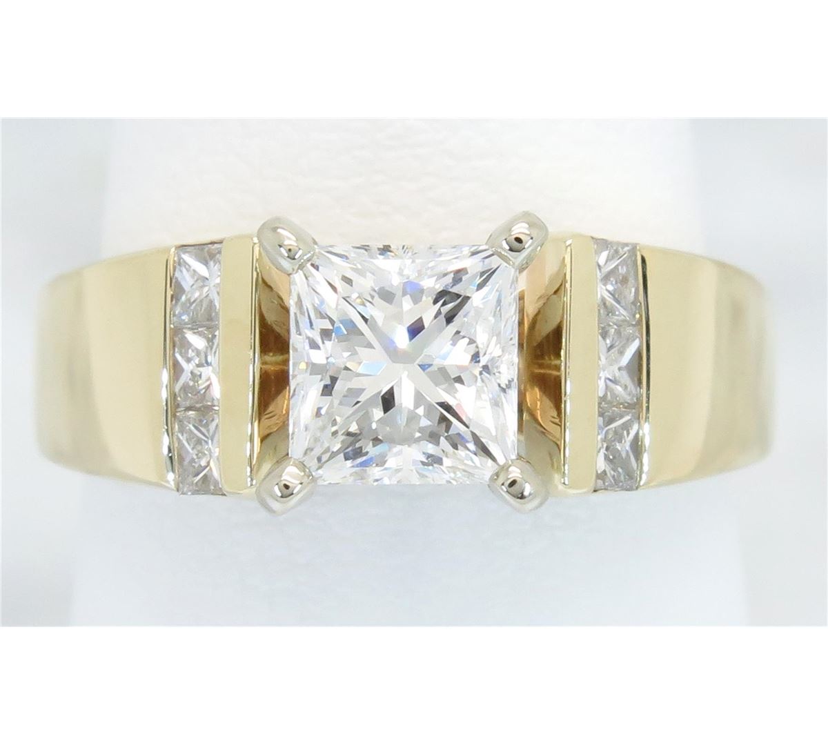 One tested 14K yellow gold diamond ring. Containing: One 1.00CT Princess Cut Diamond. Clarity: VS2, Color: F-G. 6 Princess Cut Diamonds. Approximate total diamond weight: 1.30CTW. All diamonds are graded in the mounting unless otherwise stated. Weight of ring: 4.8 grams, Size: 4.75.