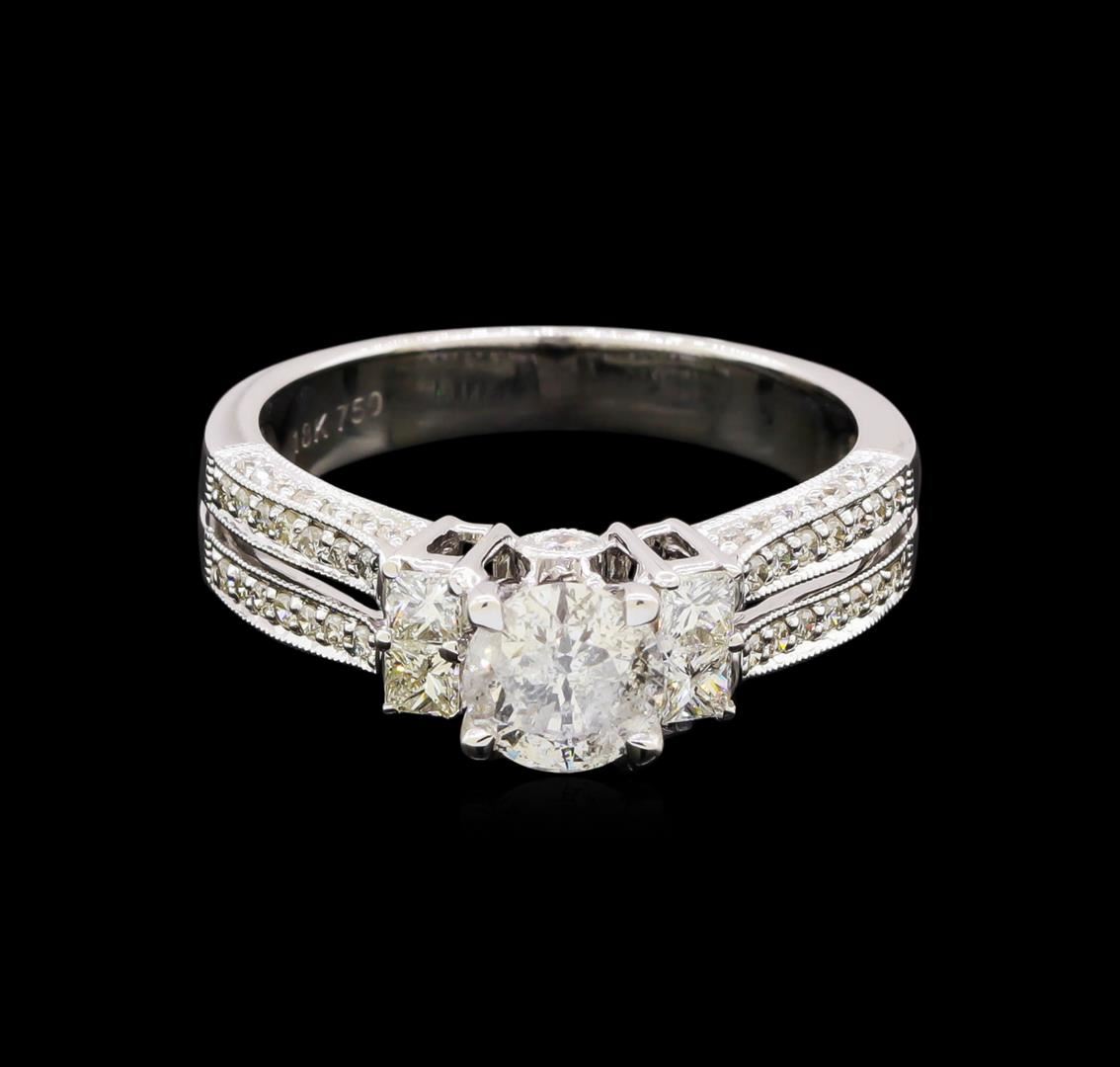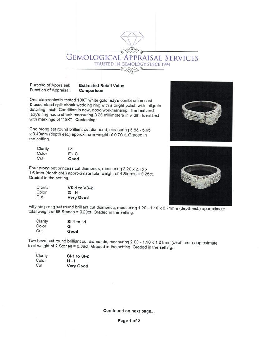 One electronically tested 18KT white gold lady's combination cast & assembled split shank wedding ring with a bright polish with milgrain detailing finish. The featured lady's ring has a shank measuring 3.26 millimeters in width. Identified with markings of "18K". Condition is new, good workmanship. Containing: One prong set round brilliant cut diamond, measuring 5.68 - 5.65 x 3.40mm (depth est.) approximate weight of 0.70ct. Graded in the setting. Clarity: I-1. Color: F - Good Four prong set princess cut diamonds, measuring 2.20 x 2.15 x 1.61mm (depth est.) approximate total weight of 4 Stones = 0.25ct. Graded in the setting. Clarity: VS-1 to VS-2. Color: G - Very Good Fifty-Six prong set round brilliant cut diamonds, measuring 1.20 - 1.10 x 0.71mm (depth est.) approximate total weight of 56 Stones = 0.29ct. Graded in the setting. Clarity: SI-1 to I-1. Color: Good Two bezel set round brilliant cut diamonds, measuring 2.00 - 1.90 x 1.21mm (depth est.) approximate total weight of 2 Stones = 0.06ct. Graded in the setting. Graded in the setting. Clarity: SI-1 to SI-2. Color: H - I. Cut Very Good. Total Weight of Diamonds 1.30ct. Total Weight of Wedding Ring 4.90gm. GAS Appraised at $6,800.00.