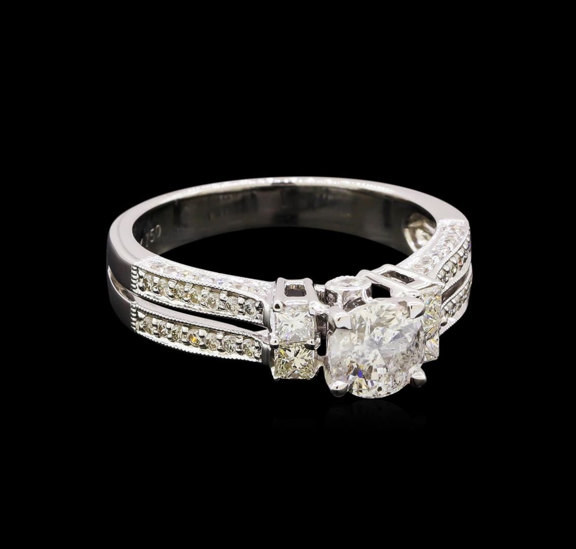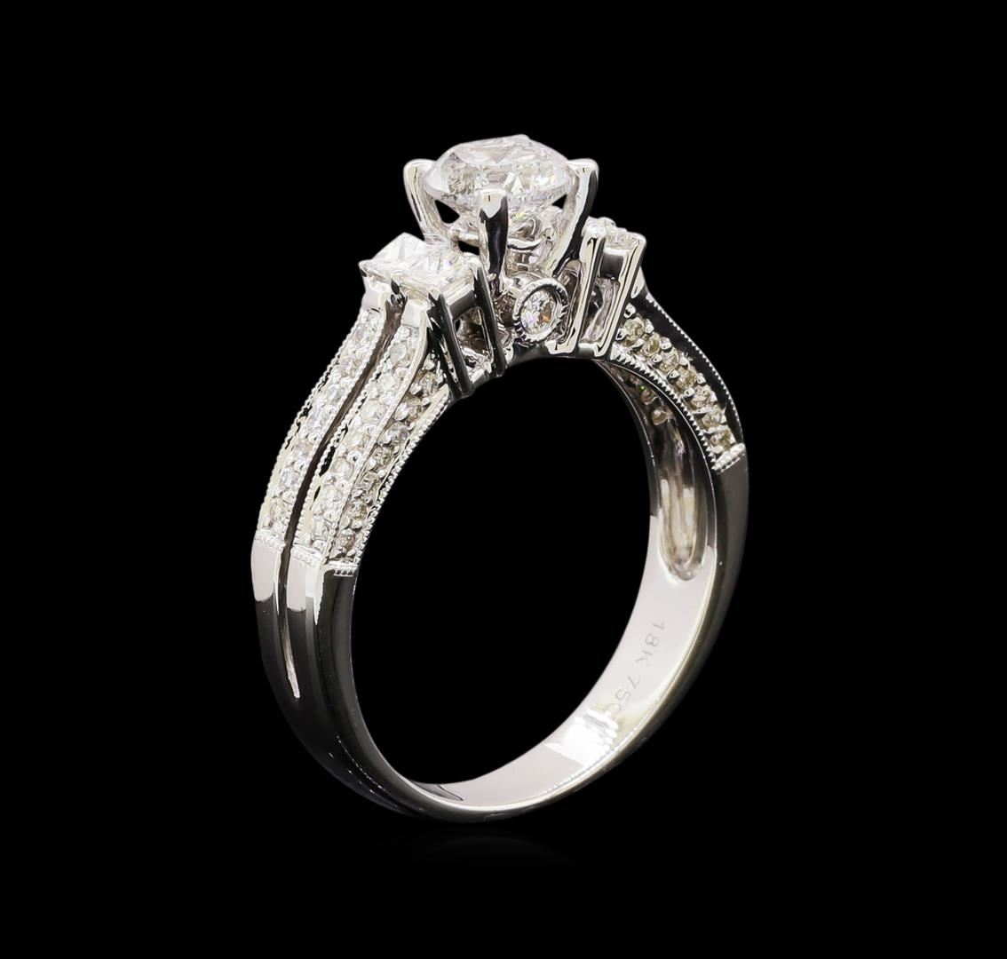 One electronically tested 18KT white gold lady's combination cast & assembled split shank wedding ring with a bright polish with milgrain detailing finish. The featured lady's ring has a shank measuring 3.26 millimeters in width. Identified with markings of "18K". Condition is new, good workmanship. Containing: One prong set round brilliant cut diamond, measuring 5.68 - 5.65 x 3.40mm (depth est.) approximate weight of 0.70ct. Graded in the setting. Clarity: I-1. Color: F - Good Four prong set princess cut diamonds, measuring 2.20 x 2.15 x 1.61mm (depth est.) approximate total weight of 4 Stones = 0.25ct. Graded in the setting. Clarity: VS-1 to VS-2. Color: G - Very Good Fifty-Six prong set round brilliant cut diamonds, measuring 1.20 - 1.10 x 0.71mm (depth est.) approximate total weight of 56 Stones = 0.29ct. Graded in the setting. Clarity: SI-1 to I-1. Color: Good Two bezel set round brilliant cut diamonds, measuring 2.00 - 1.90 x 1.21mm (depth est.) approximate total weight of 2 Stones = 0.06ct. Graded in the setting. Graded in the setting. Clarity: SI-1 to SI-2. Color: H - I. Cut Very Good. Total Weight of Diamonds 1.30ct. Total Weight of Wedding Ring 4.90gm. GAS Appraised at $6,800.00.