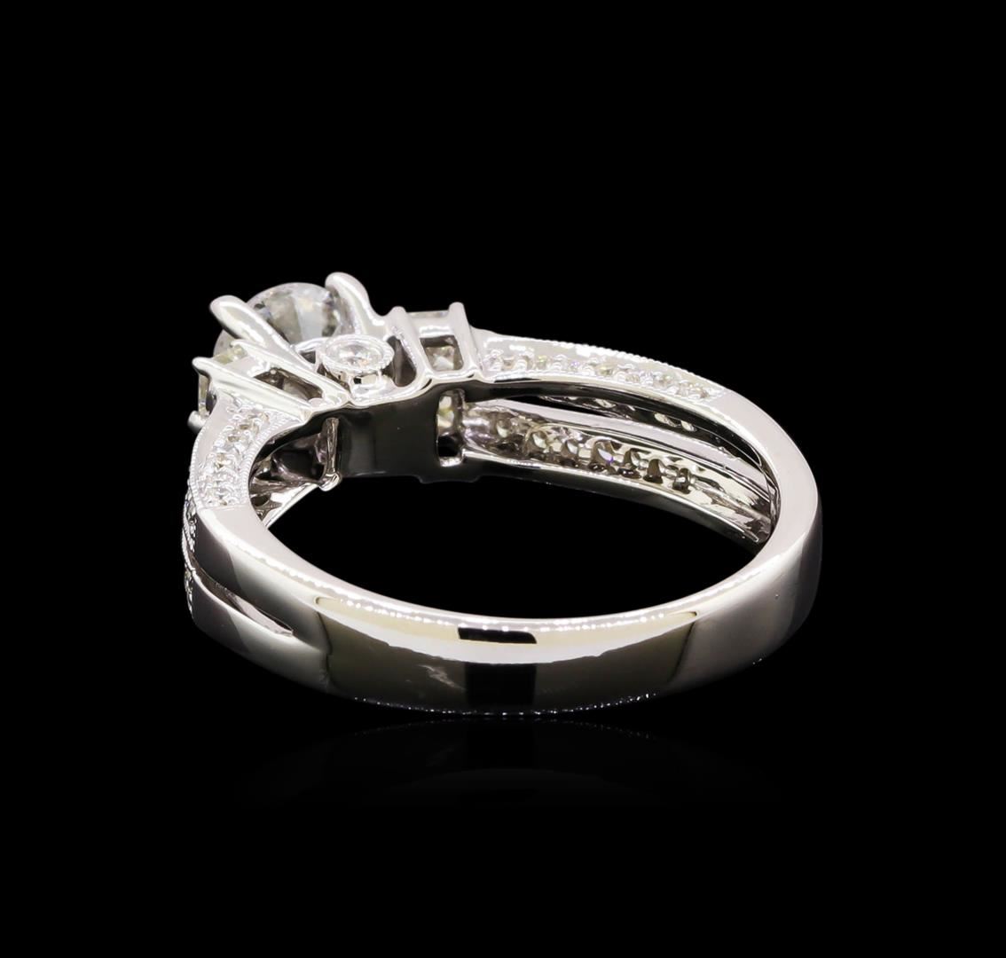 One electronically tested 18KT white gold lady's combination cast & assembled split shank wedding ring with a bright polish with milgrain detailing finish. The featured lady's ring has a shank measuring 3.26 millimeters in width. Identified with markings of "18K". Condition is new, good workmanship. Containing: One prong set round brilliant cut diamond, measuring 5.68 - 5.65 x 3.40mm (depth est.) approximate weight of 0.70ct. Graded in the setting. Clarity: I-1. Color: F - Good Four prong set princess cut diamonds, measuring 2.20 x 2.15 x 1.61mm (depth est.) approximate total weight of 4 Stones = 0.25ct. Graded in the setting. Clarity: VS-1 to VS-2. Color: G - Very Good Fifty-Six prong set round brilliant cut diamonds, measuring 1.20 - 1.10 x 0.71mm (depth est.) approximate total weight of 56 Stones = 0.29ct. Graded in the setting. Clarity: SI-1 to I-1. Color: Good Two bezel set round brilliant cut diamonds, measuring 2.00 - 1.90 x 1.21mm (depth est.) approximate total weight of 2 Stones = 0.06ct. Graded in the setting. Graded in the setting. Clarity: SI-1 to SI-2. Color: H - I. Cut Very Good. Total Weight of Diamonds 1.30ct. Total Weight of Wedding Ring 4.90gm. GAS Appraised at $6,800.00.
