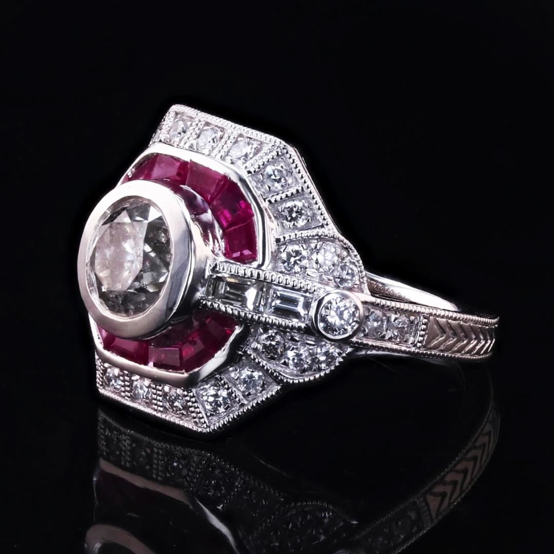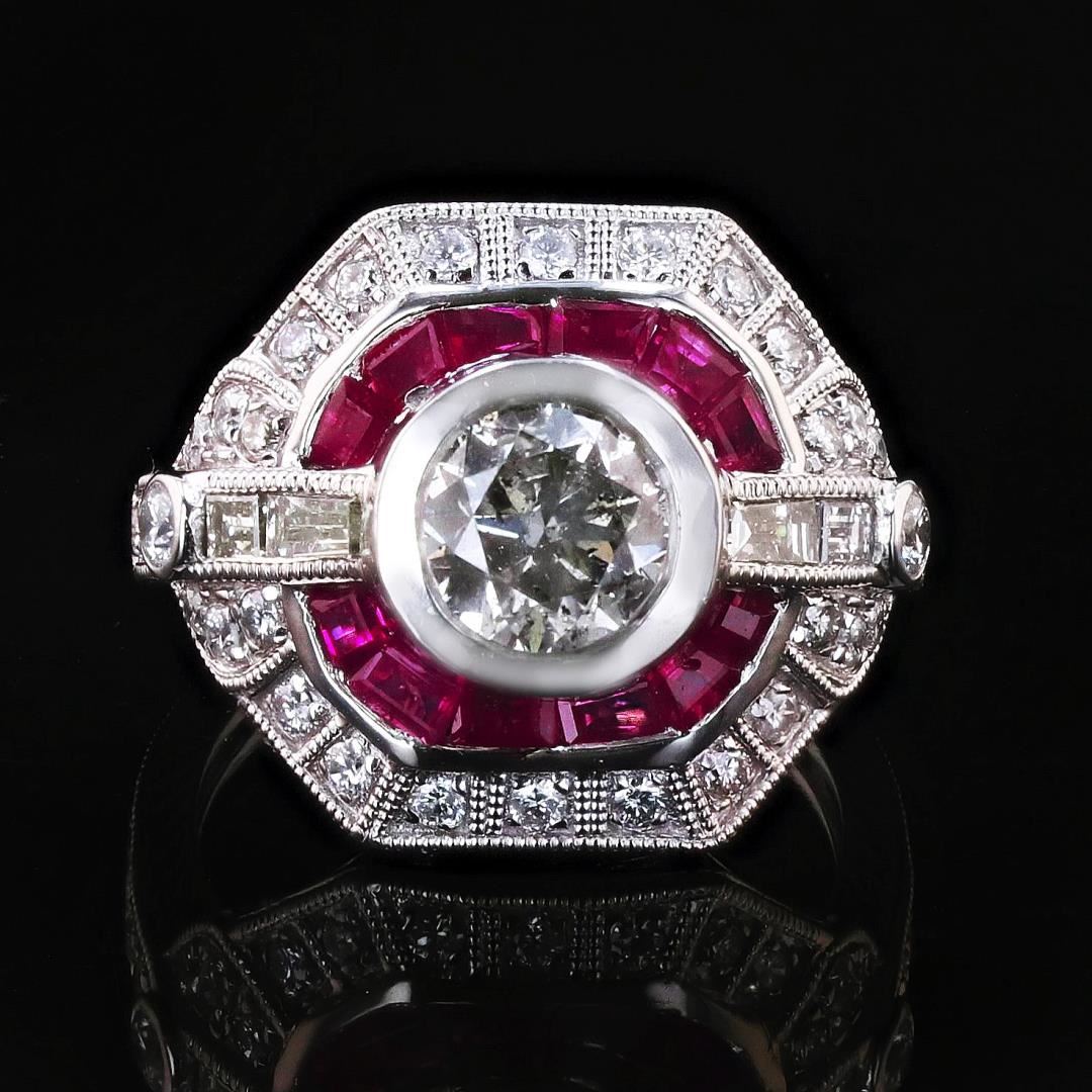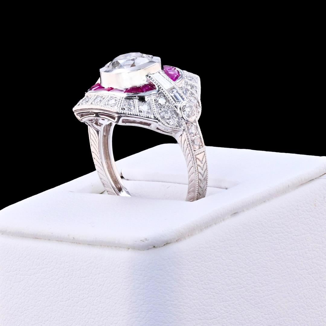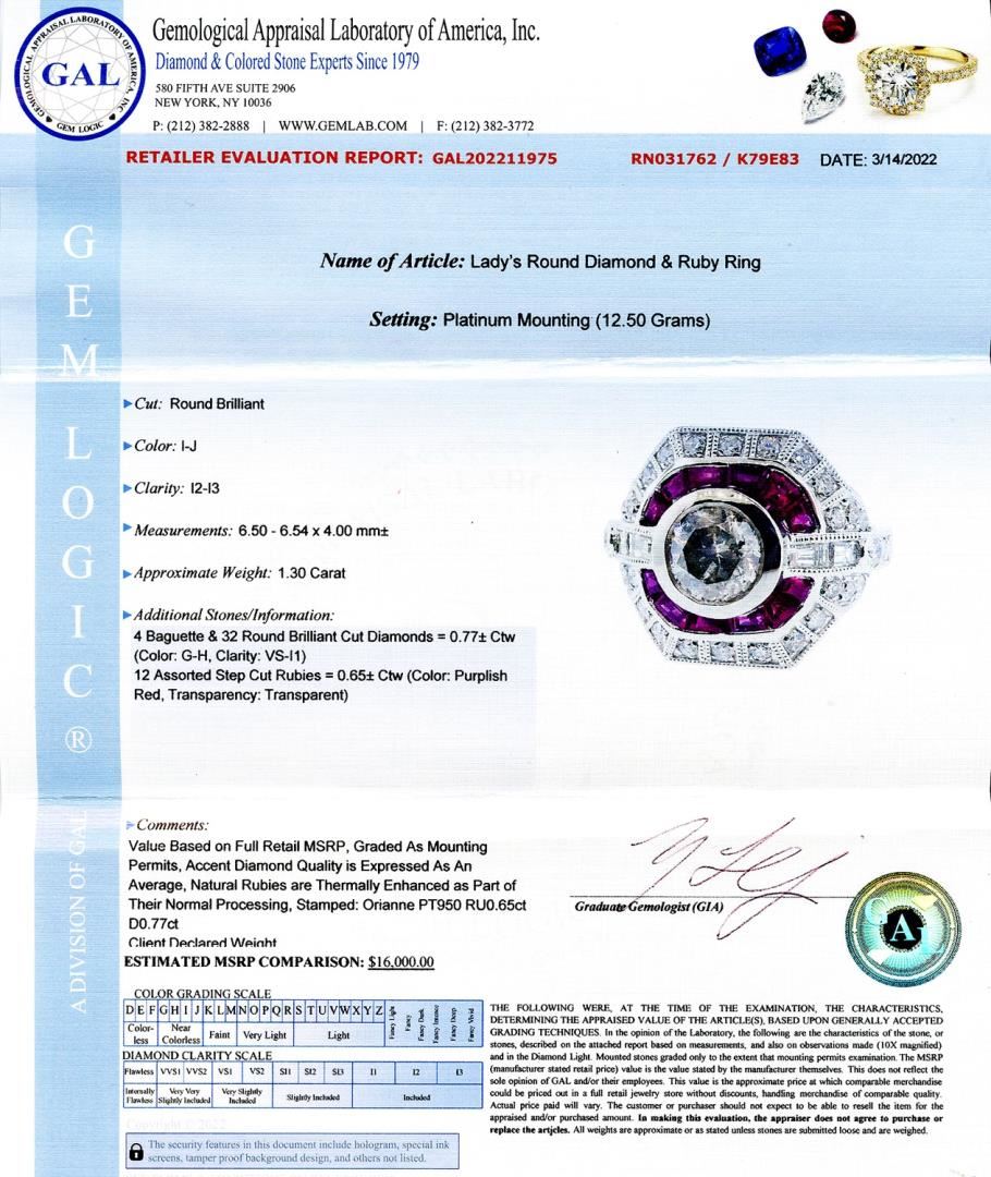 Name of Article: Lady's Round Diamond & Ruby Ring Setting: Platinum Mounting (12.50 Grams) Cut Round Brilliant Color: I - J Clarity: I2 to I3 Measurements: 6.50 - 6.54 x 4.00mm± Approximate Weight: 1.30 Carat Additional Stones/Information: 4 Baguette & 32 Round Brilliant Cut Diamonds = 0.77± Ctw (Color: G - H, Clarity: VS to I1) 12 Assorted Step Cut Rubies = 0.65± Ctw (Color: Purplish Red, Transparency: Transparent)