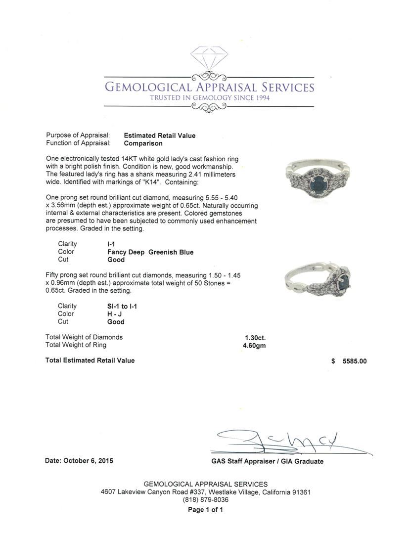 One electronically tested 14KT white gold lady's cast fashion ring with a bright polish finish. The featured lady's ring has a shank measuring 2.41 millimeters wide. Identified with markings of "K14". Condition is new, good workmanship. Containing: One prong set round brilliant cut diamond, measuring 5.55 - 5.40 x 3.56mm (depth est.) approximate weight of 0.65ct. Naturally occurring internal & external characteristics are present. Colored gemstones are presumed to have been subjected to commonly used enhancement processes. Graded in the setting. Clarity: I-1 Cut Good Fifty prong set round brilliant cut diamonds, measuring 1.50 - 1.45 x 0.96mm (depth est.) approximate total weight of 50 Stones = 0.65ct. Graded in the setting. Clarity: SI-1 to I-1. Color: H - Good. Total Weight of Diamonds 1.30ct. Total Weight of Ring 4.60gm. GAS Appraised at $5,585.00.