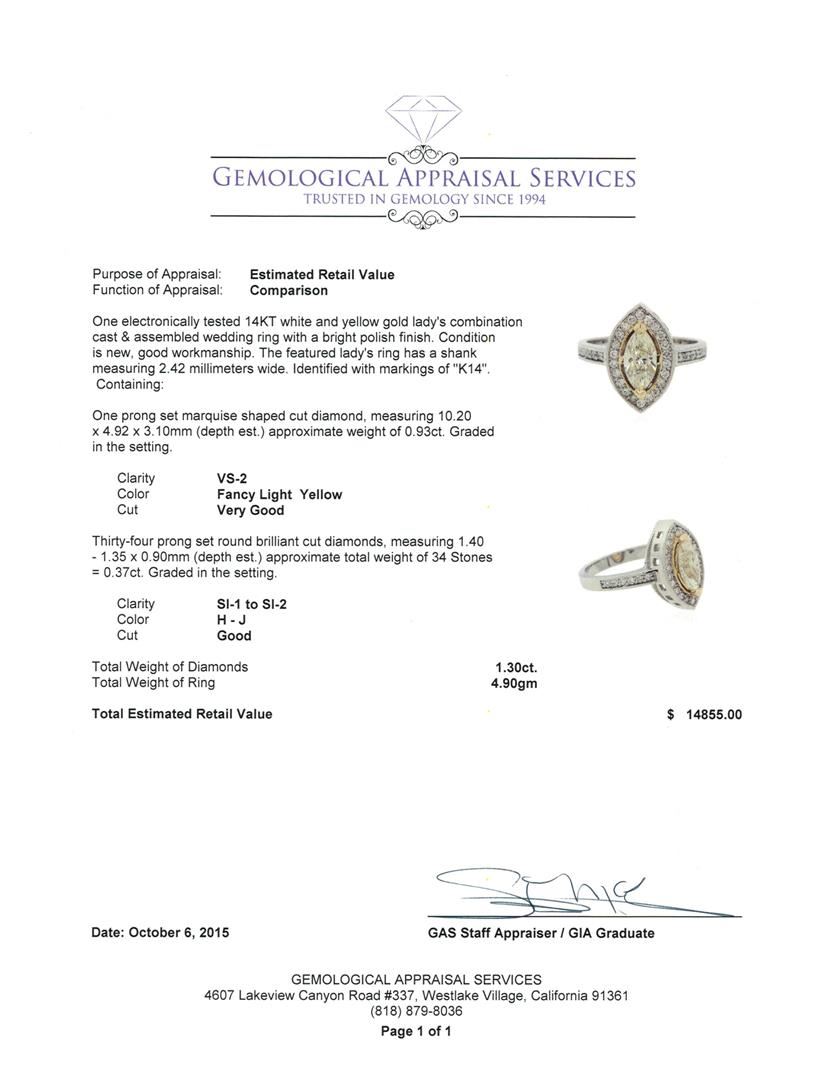 One electronically tested 14KT white and yellow gold lady's combination cast & assembled wedding ring with a bright polish finish. The featured lady's ring has a shank measuring 2.42 millimeters wide. Identified with markings of "K14". Condition is new, good workmanship. Containing: One prong set marquise shaped cut diamond, measuring 10.20 x 4.92 x 3.10mm (depth est.) approximate weight of 0.93ct. Graded in the setting. Clarity: VS-2 Cut Very Good Thirty-Four prong set round brilliant cut diamonds, measuring 1.40 - 1.35 x 0.90mm (depth est.) approximate total weight of 34 Stones = 0.37ct. Graded in the setting. Clarity: SI-1 to SI-2. Color: H - Good. Total Weight of Diamonds 1.30ct. Total Weight of Ring 4.90gm. GAS Appraised at $14,855.00.