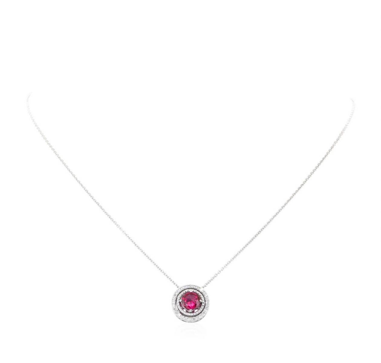 One sterling silver pendant with an attached 14KT white gold 1mm rounded cable link chain measuring fifteen inches in length weighing 3.8 grams, containing one lab-created ruby weighing 1.20ct and diamonds weighing 0.10ctw.