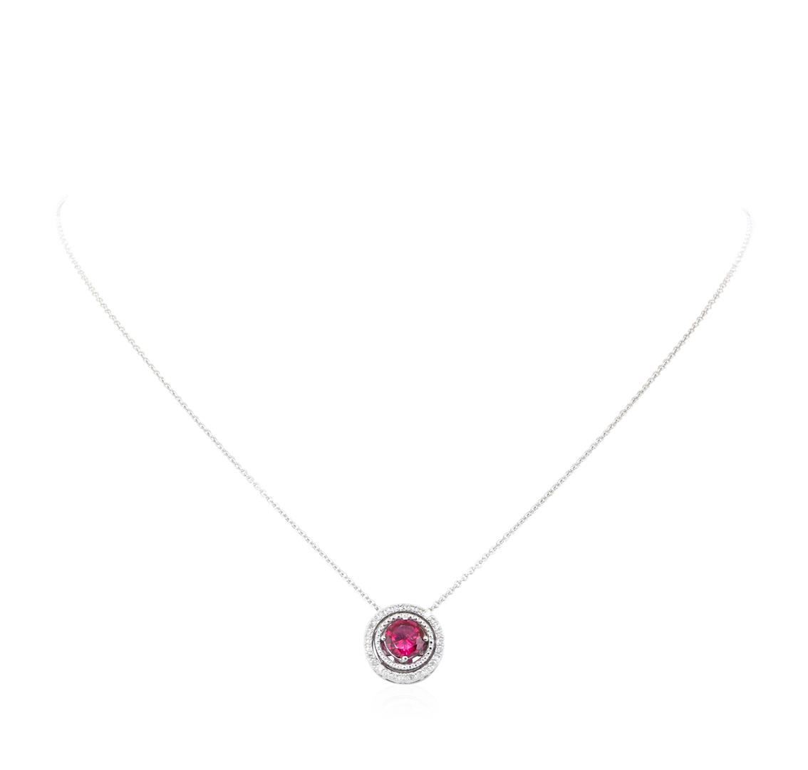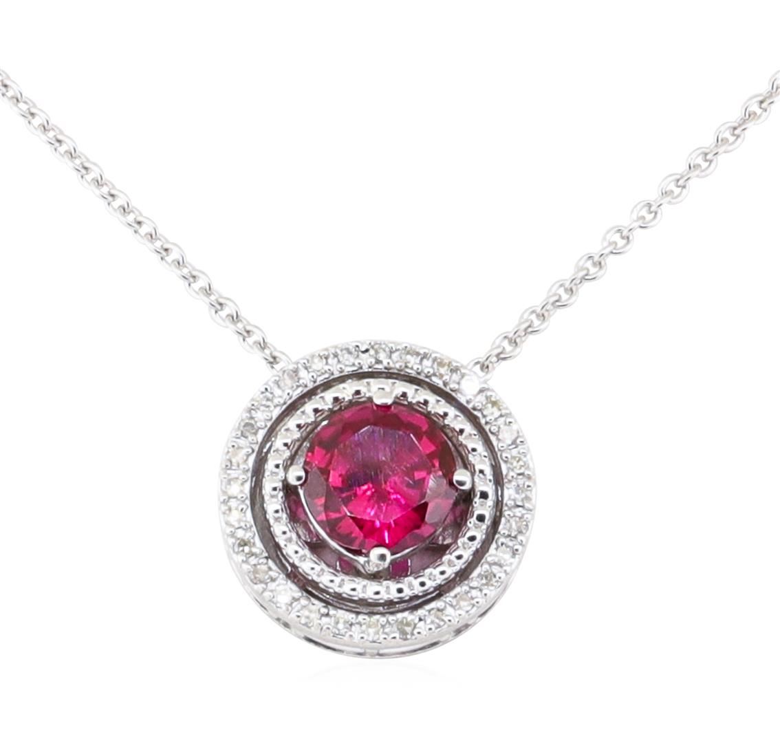 One sterling silver pendant with an attached 14KT white gold 1mm rounded cable link chain measuring fifteen inches in length weighing 3.8 grams, containing one lab-created ruby weighing 1.20ct and diamonds weighing 0.10ctw.