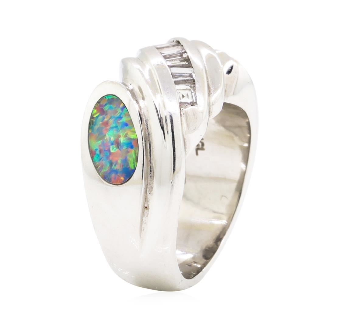 One electronically tested platinum lady's cast fashion ring with a bypass shank with a bright polish finish. The featured lady's ring has a shank measuring 5.70 millimeters wide. Identified with markings of 'PLAT'. Condition is used, good workmanship. Containing: Two crystal opals that are cut in a oval shaped cabochon and are inlay set, measuring 8.00 mm long x 4.70 mm wide, and 1.25 mm thick and the approximate weight is 0.80 carats. The opals have a exceptionally bright, red-blue multicolor play of color (fire) in a rolling flashfire pattern; a low dome; a good cut; no inclusions; consistent in their brightness and pattern; and are not directional. Colored gemstones are presumed to have been subjected to commonly used enhancement processes. Graded in the setting. Seven channel set baguette cut diamonds, measuring from 2.10 x 1.80 x 1.53mm (depth est.) to 2.80 x 2.00 x 1.70mm (depth est.) approximate total weight of 7 Stones = 0.50ct. Graded in the setting. Color G - H Clarity VS-1 to VS-2 Cut Good. Total Weight of Diamonds 0.50ct.. Total Weight of Opals 0.80ct.. Total Weight of Ring 18.00gm GAS Appraised at $4785.00. GAS Appraised.
