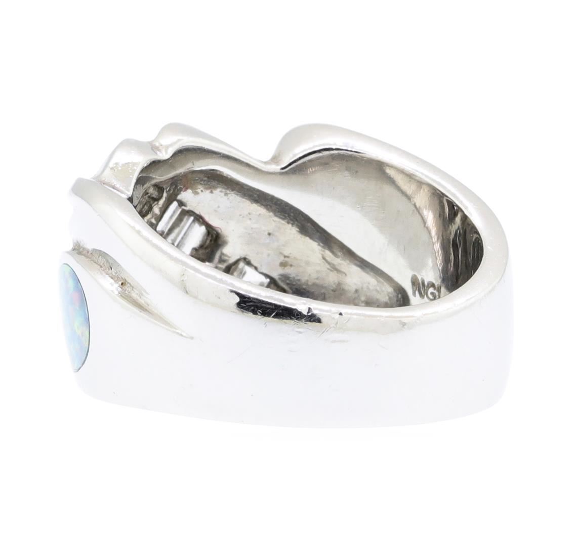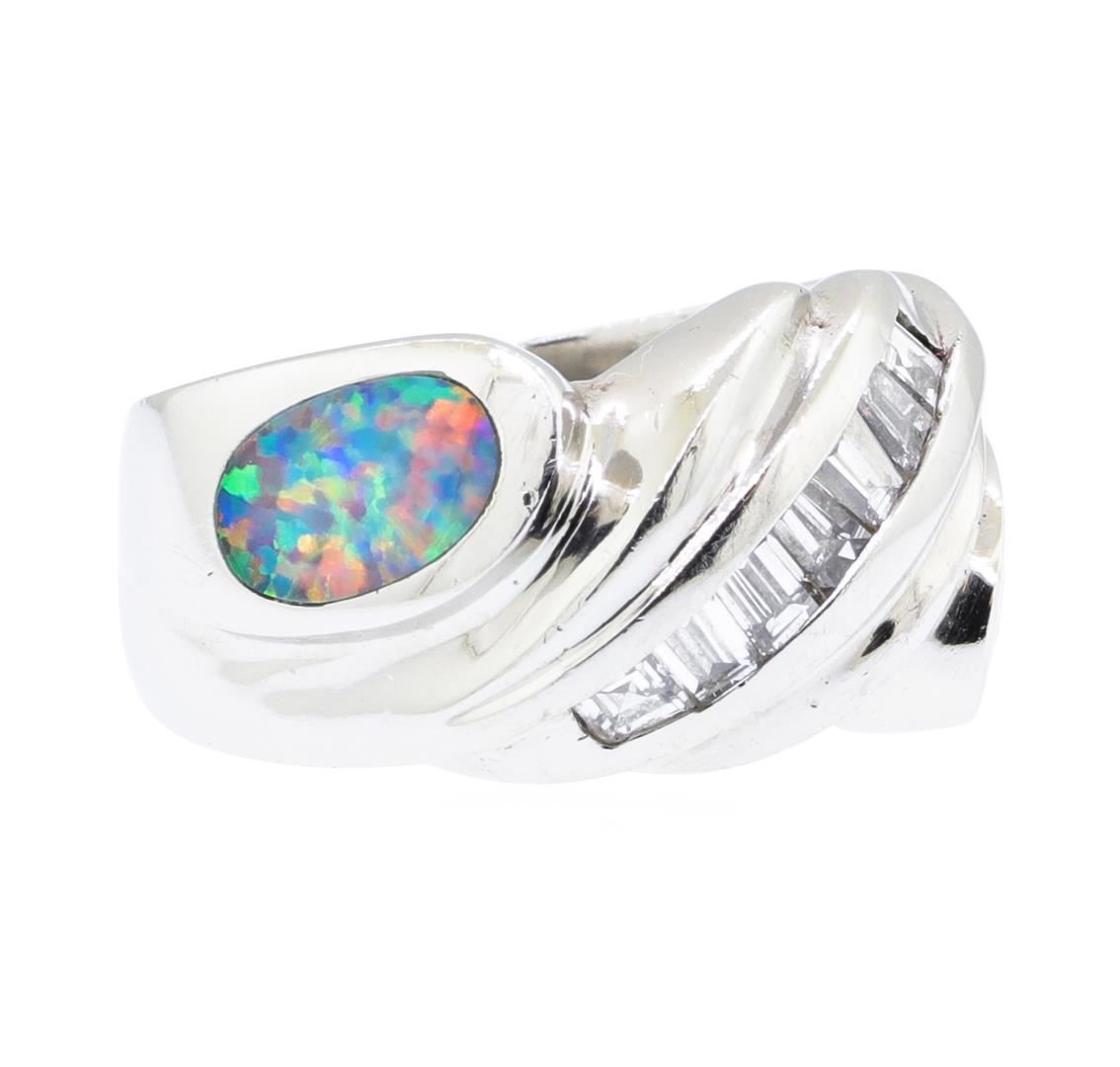 One electronically tested platinum lady's cast fashion ring with a bypass shank with a bright polish finish. The featured lady's ring has a shank measuring 5.70 millimeters wide. Identified with markings of 'PLAT'. Condition is used, good workmanship. Containing: Two crystal opals that are cut in a oval shaped cabochon and are inlay set, measuring 8.00 mm long x 4.70 mm wide, and 1.25 mm thick and the approximate weight is 0.80 carats. The opals have a exceptionally bright, red-blue multicolor play of color (fire) in a rolling flashfire pattern; a low dome; a good cut; no inclusions; consistent in their brightness and pattern; and are not directional. Colored gemstones are presumed to have been subjected to commonly used enhancement processes. Graded in the setting. Seven channel set baguette cut diamonds, measuring from 2.10 x 1.80 x 1.53mm (depth est.) to 2.80 x 2.00 x 1.70mm (depth est.) approximate total weight of 7 Stones = 0.50ct. Graded in the setting. Color G - H Clarity VS-1 to VS-2 Cut Good. Total Weight of Diamonds 0.50ct.. Total Weight of Opals 0.80ct.. Total Weight of Ring 18.00gm GAS Appraised at $4785.00. GAS Appraised.