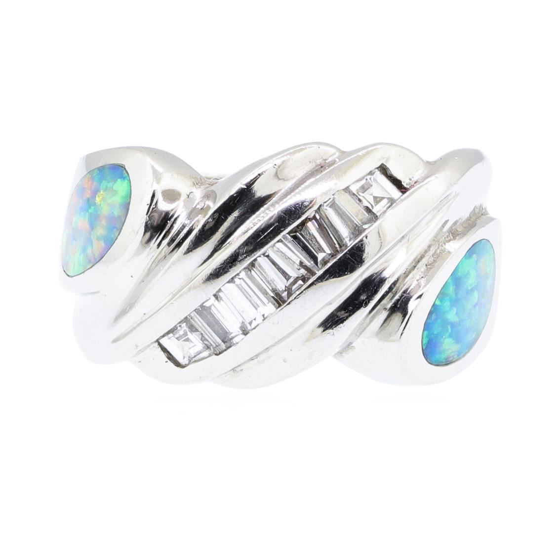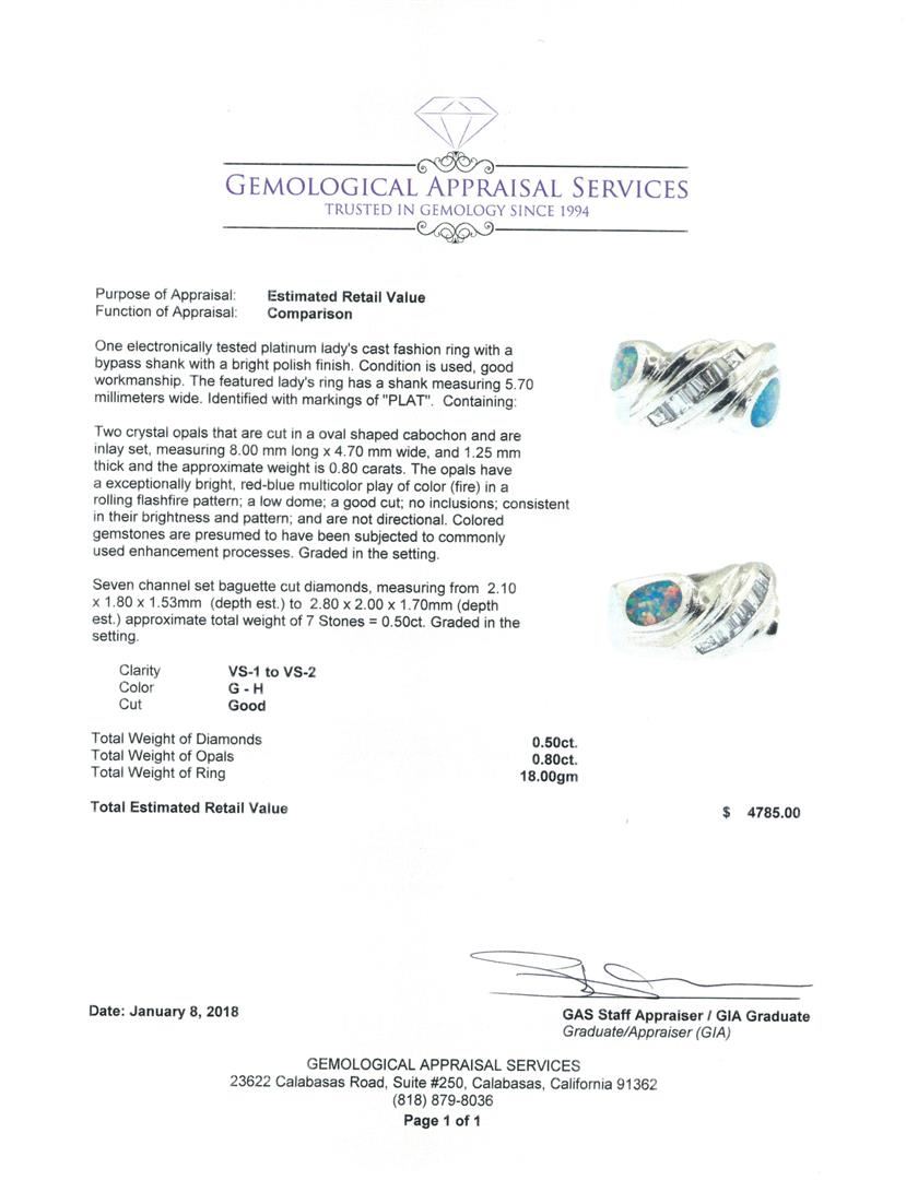 One electronically tested platinum lady's cast fashion ring with a bypass shank with a bright polish finish. The featured lady's ring has a shank measuring 5.70 millimeters wide. Identified with markings of 'PLAT'. Condition is used, good workmanship. Containing: Two crystal opals that are cut in a oval shaped cabochon and are inlay set, measuring 8.00 mm long x 4.70 mm wide, and 1.25 mm thick and the approximate weight is 0.80 carats. The opals have a exceptionally bright, red-blue multicolor play of color (fire) in a rolling flashfire pattern; a low dome; a good cut; no inclusions; consistent in their brightness and pattern; and are not directional. Colored gemstones are presumed to have been subjected to commonly used enhancement processes. Graded in the setting. Seven channel set baguette cut diamonds, measuring from 2.10 x 1.80 x 1.53mm (depth est.) to 2.80 x 2.00 x 1.70mm (depth est.) approximate total weight of 7 Stones = 0.50ct. Graded in the setting. Color G - H Clarity VS-1 to VS-2 Cut Good. Total Weight of Diamonds 0.50ct.. Total Weight of Opals 0.80ct.. Total Weight of Ring 18.00gm GAS Appraised at $4785.00. GAS Appraised.