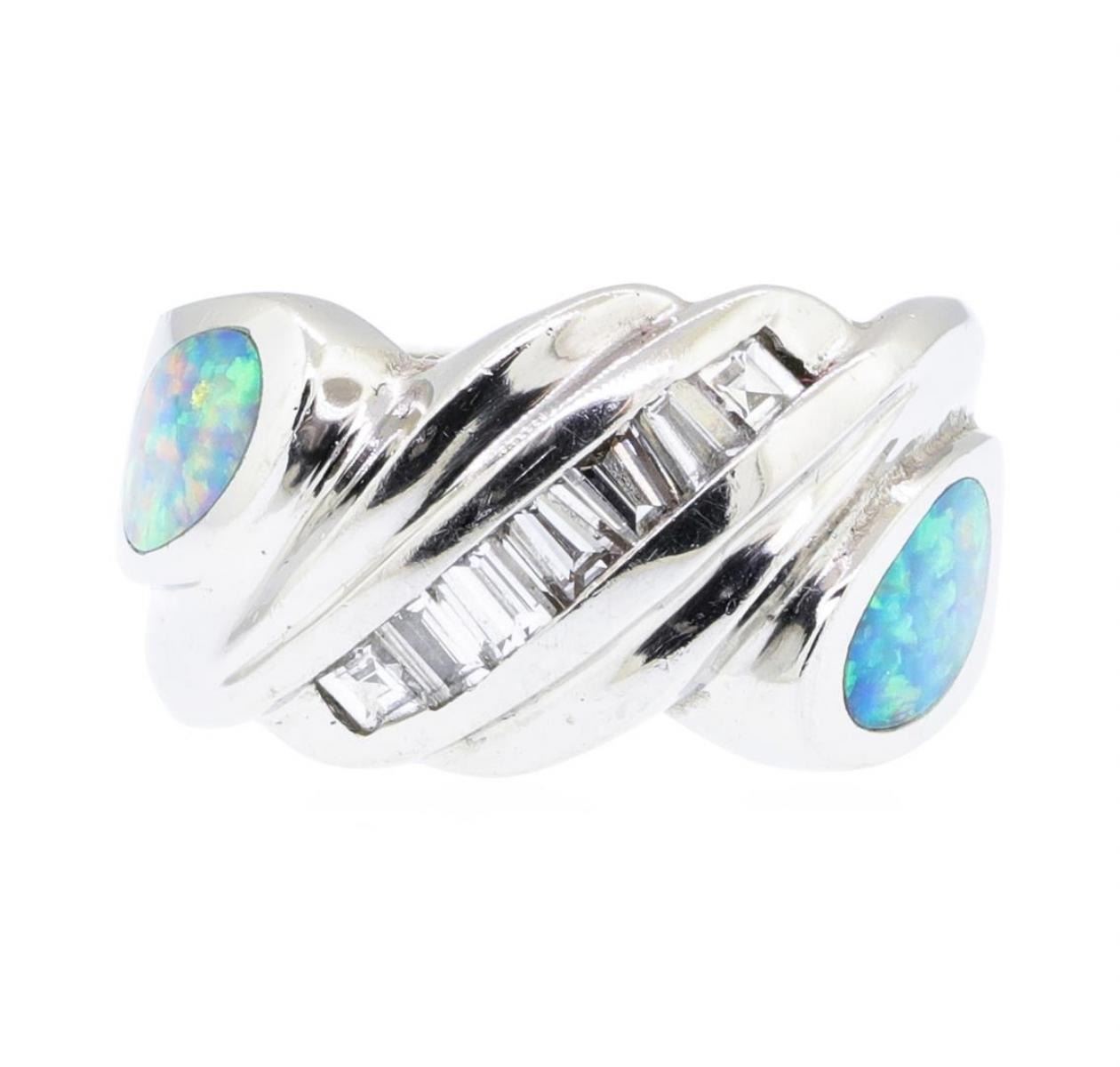 One electronically tested platinum lady's cast fashion ring with a bypass shank with a bright polish finish. The featured lady's ring has a shank measuring 5.70 millimeters wide. Identified with markings of 'PLAT'. Condition is used, good workmanship. Containing: Two crystal opals that are cut in a oval shaped cabochon and are inlay set, measuring 8.00 mm long x 4.70 mm wide, and 1.25 mm thick and the approximate weight is 0.80 carats. The opals have a exceptionally bright, red-blue multicolor play of color (fire) in a rolling flashfire pattern; a low dome; a good cut; no inclusions; consistent in their brightness and pattern; and are not directional. Colored gemstones are presumed to have been subjected to commonly used enhancement processes. Graded in the setting. Seven channel set baguette cut diamonds, measuring from 2.10 x 1.80 x 1.53mm (depth est.) to 2.80 x 2.00 x 1.70mm (depth est.) approximate total weight of 7 Stones = 0.50ct. Graded in the setting. Color G - H Clarity VS-1 to VS-2 Cut Good. Total Weight of Diamonds 0.50ct.. Total Weight of Opals 0.80ct.. Total Weight of Ring 18.00gm GAS Appraised at $4785.00. GAS Appraised.