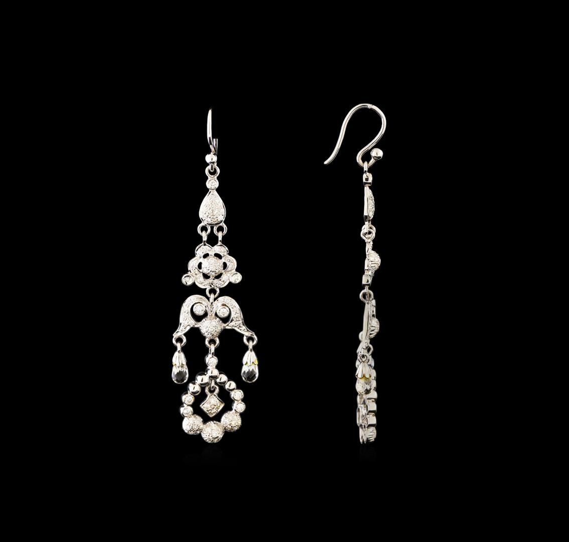 One pair electronically tested 18KT white gold ladies cast & assembled diamond and quartz chandelier style earrings with French hooks. Each earring is two and three-quarter inches in length. Bright polish finish. Condition is good. Containing: One Hundred Seventy-Six bead & bezel set round brilliant cut diamonds, measuring 1.70 - 1.00 x 0.81mm (depth est.) approximate total weight of 176 Stones = 1.56ct. Clarity VS-1 to VS-2. Color: G - I Four briolette mixed cut natural quartz's, measuring 4.80 x 3.40 x 3.40mm, approximate total weight of 1.30ct., clarity is eye clean, colorless, very slightly grayish, white color, (GIA W 0/3), cut is good. Transmitting light somewhat diffusely, translucent. Measurements & the color grade are an average for the group. Graded in the setting. Total Weight of Colored Stones 1.30ct.. Total Weight of Diamonds 1.56ct.. Total Weight of Earrings 11.15gm. AIG Appraised at $8,750.00.